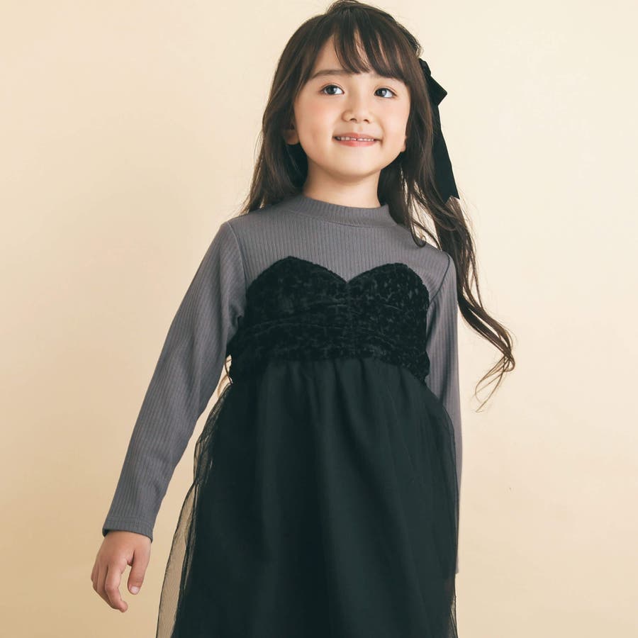 プリンセスのようにふんわり広がるチュールのスカートやハートカットのビスチェを重ね着している風のデザインは女の子心をくすぐるポイント。