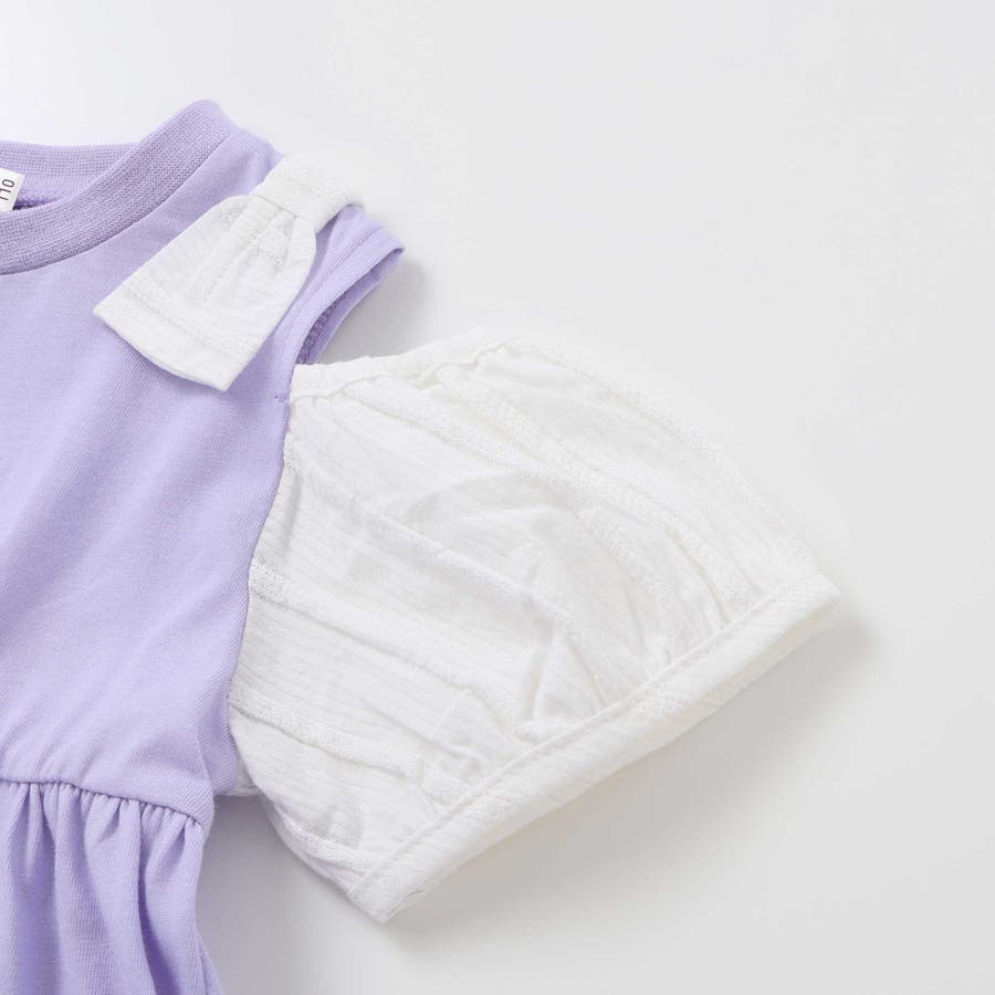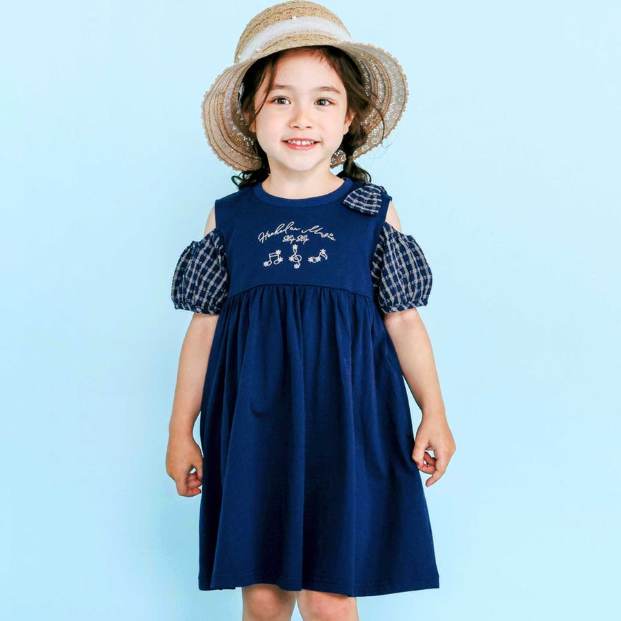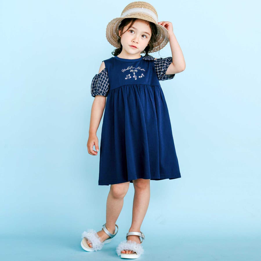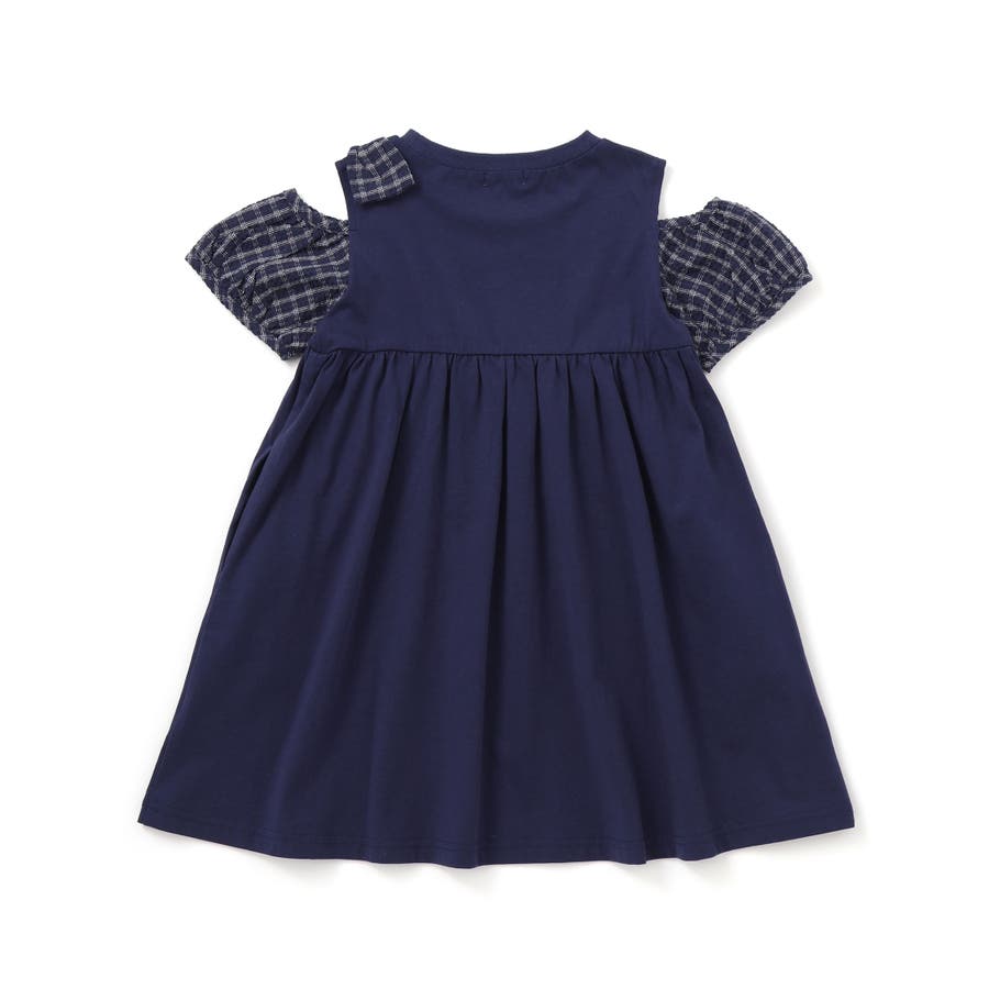 ストライプチェック袖リボンオフショルワンピース(90~130cm)