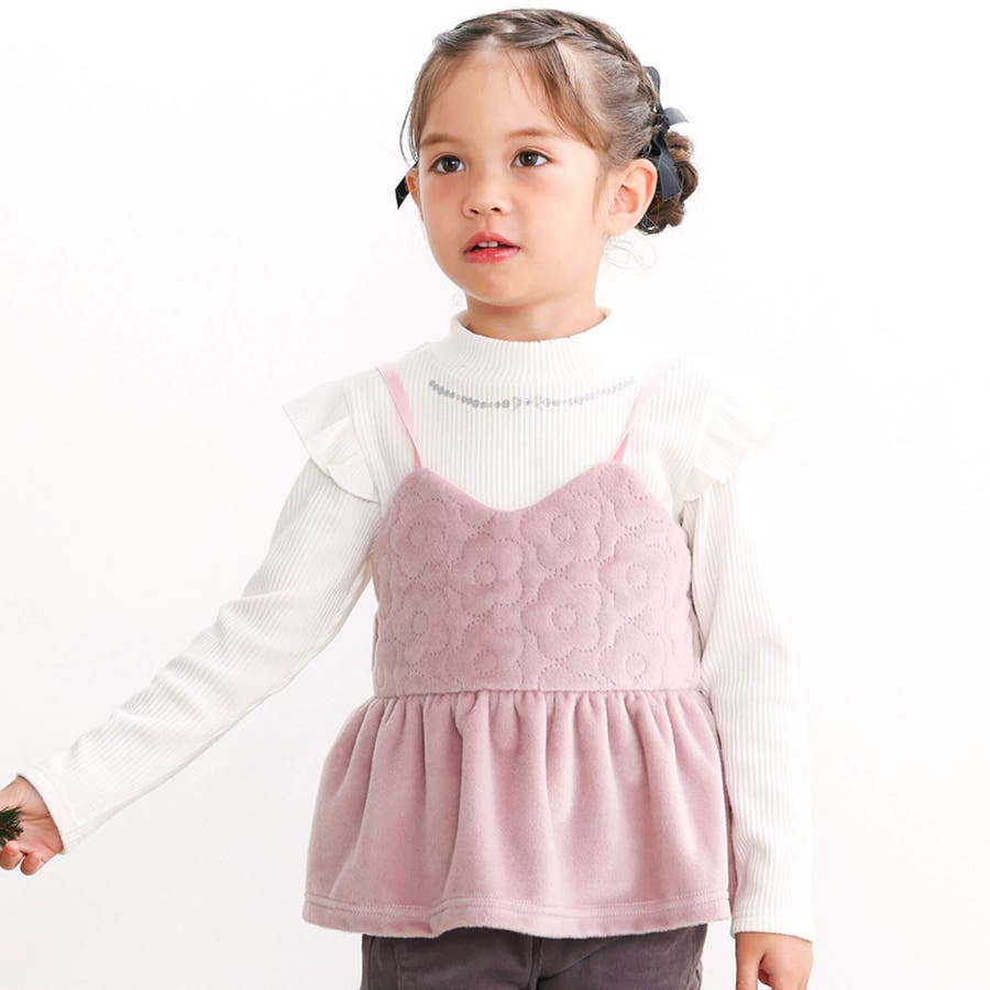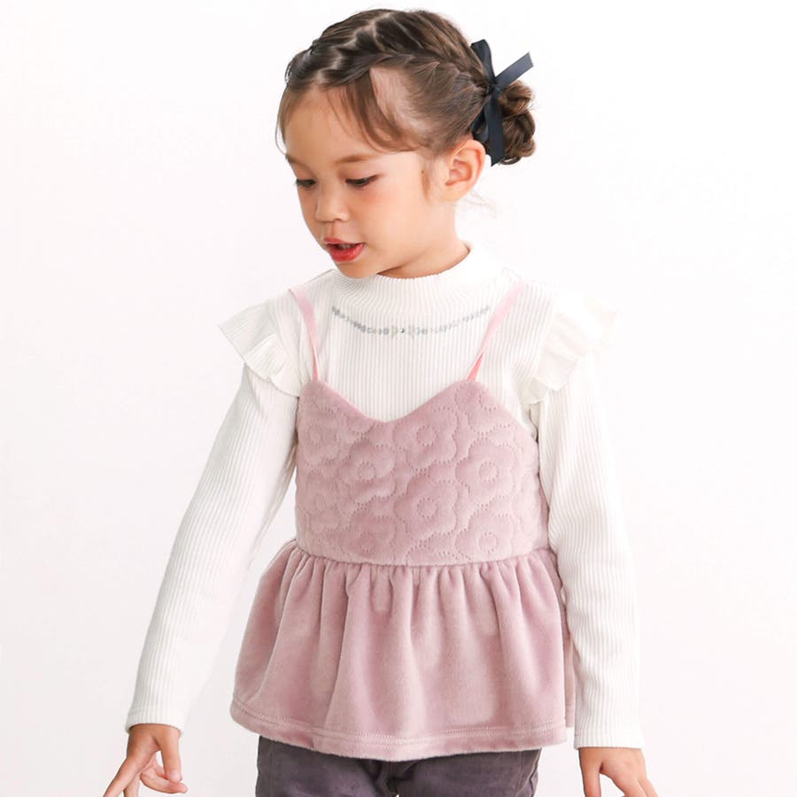 オフホワイト:女の子らしいピンクの身生地にキュートなまあるいお花型のキルトがカワイイ♪ホワイトのTシャツで女の子らしい甘さをプラス。