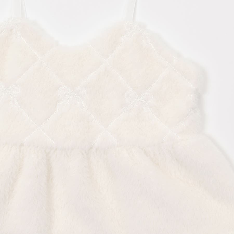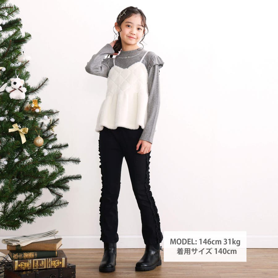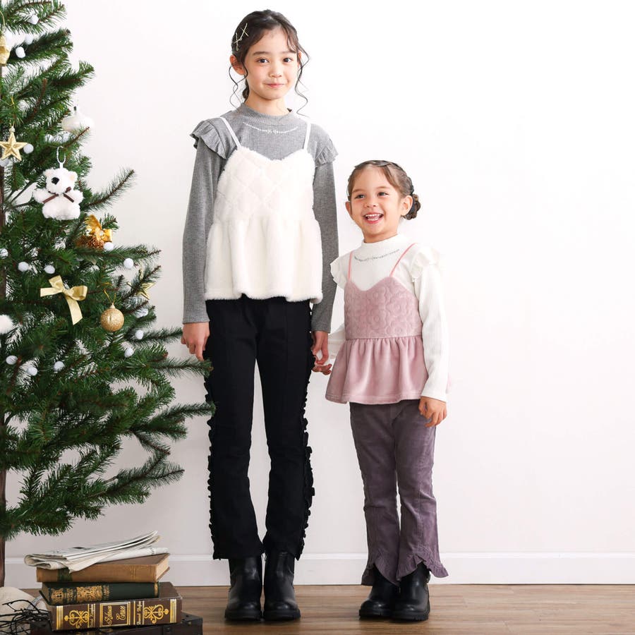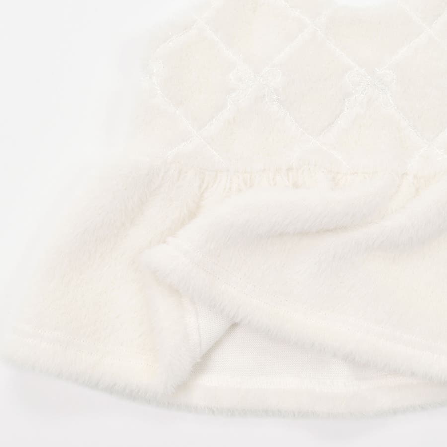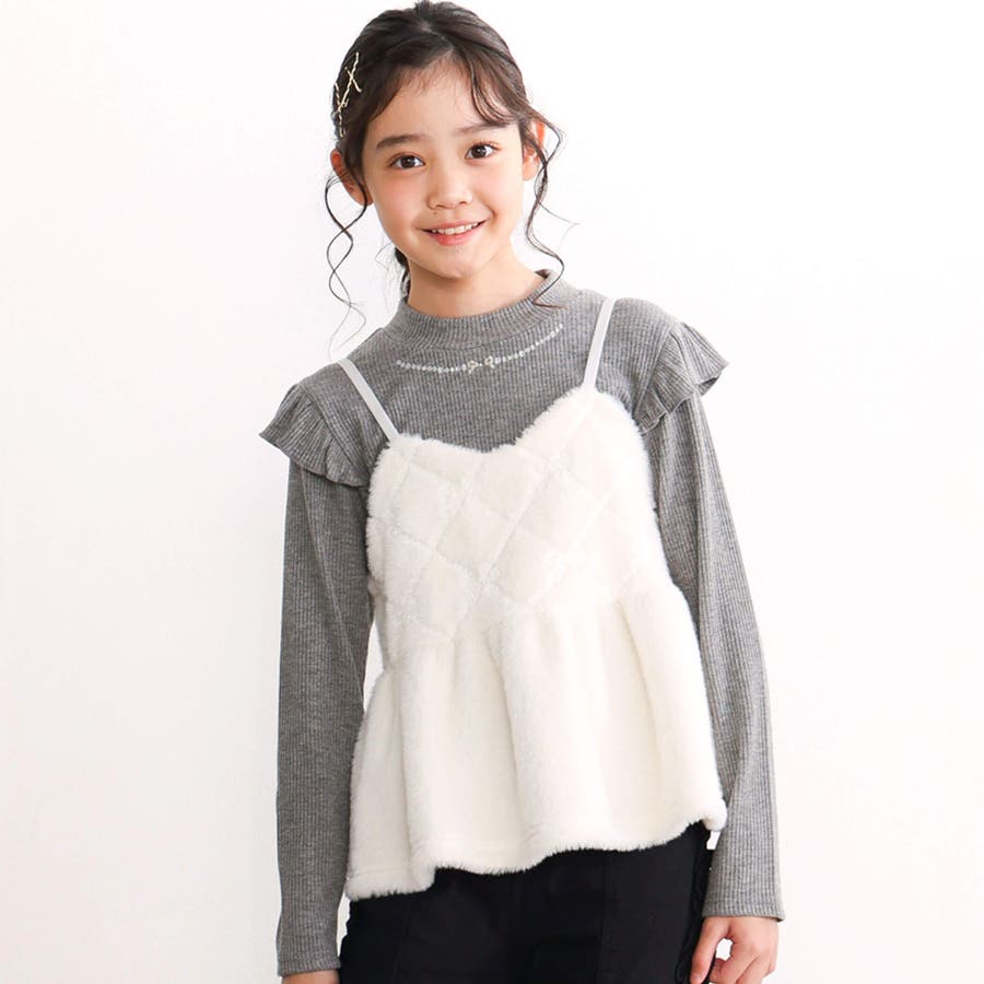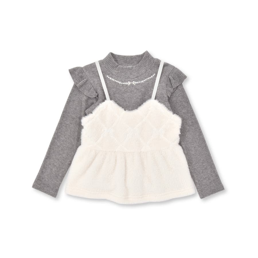 グレー:キルト模様の中にはリボンが隠れているから探してみてね。ラメが入ったファーを使用しているからさりげなくきらめくのがポイント!グレーのTシャツでキャミソールが映える1着。