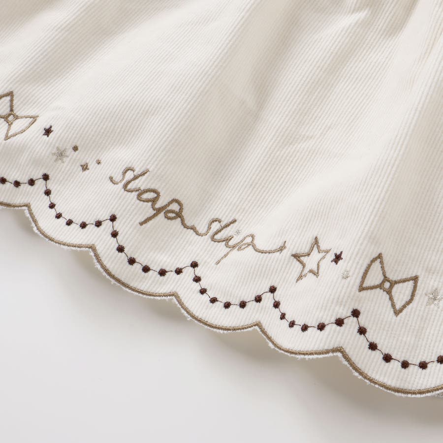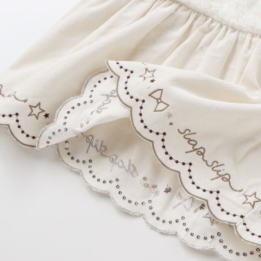 裾のスカラップにはさりげなくきらめく刺しゅうをオン。