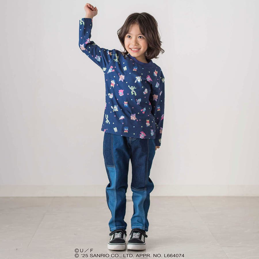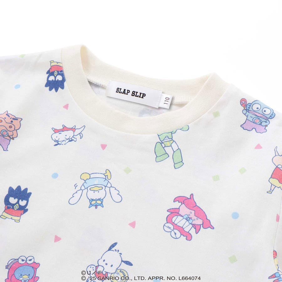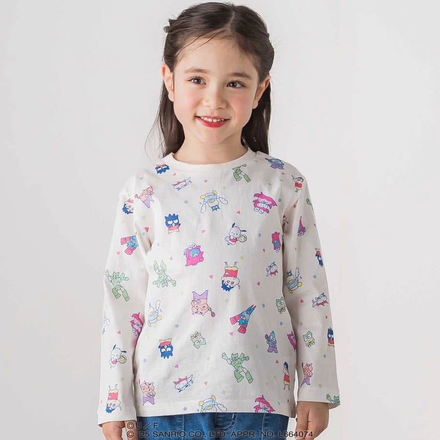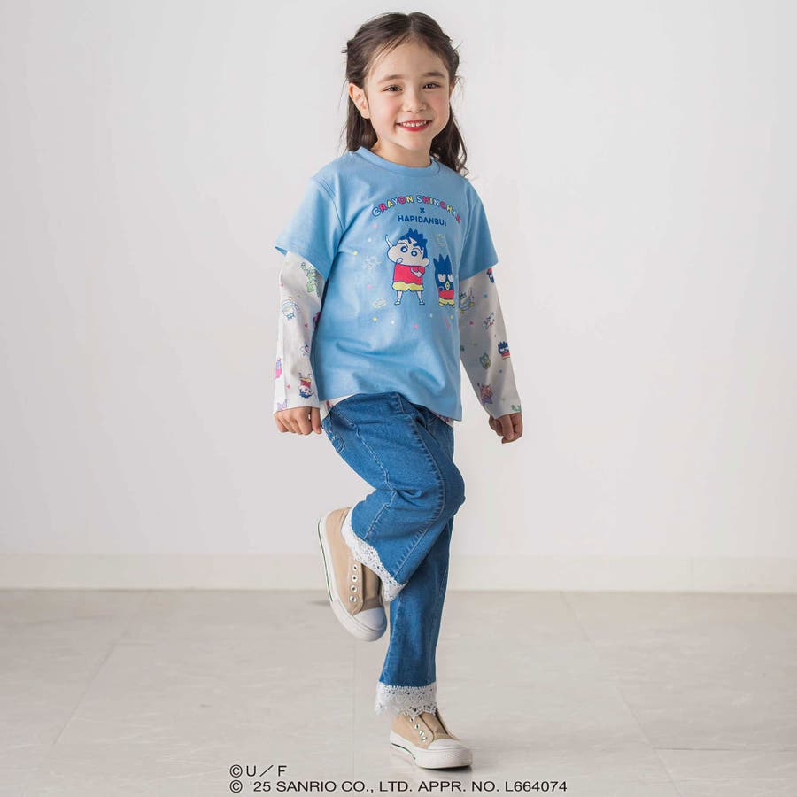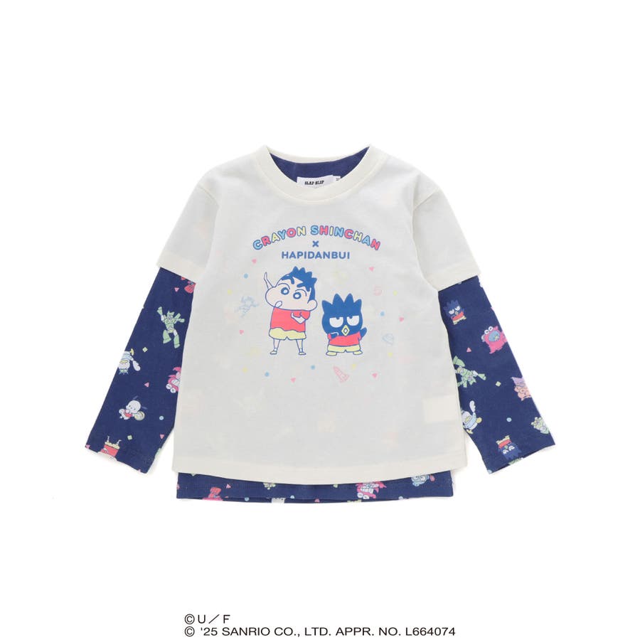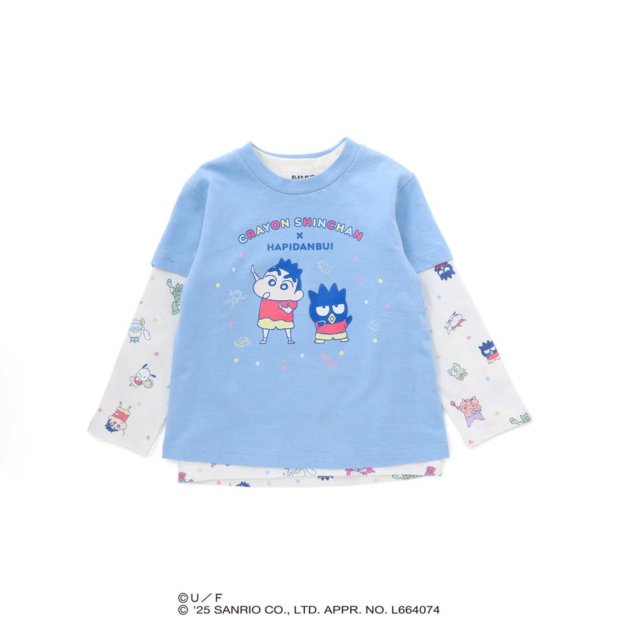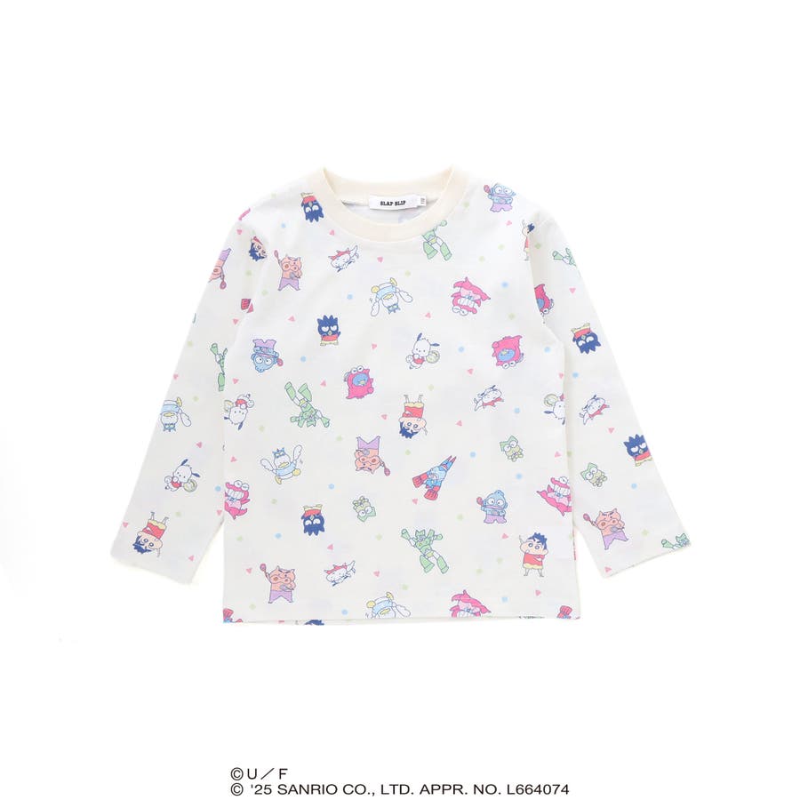 長袖Tシャツは、「クレヨンしんちゃん」と“はぴだんぶい”のキャラクターたちが仲良く登場する総柄プリント。