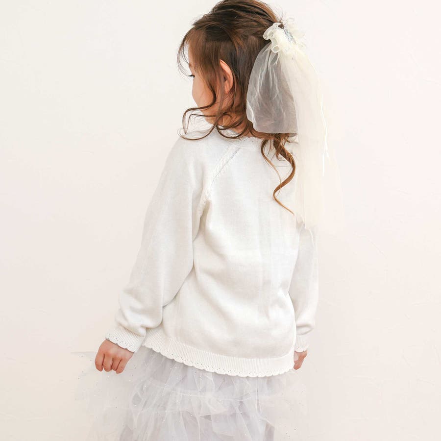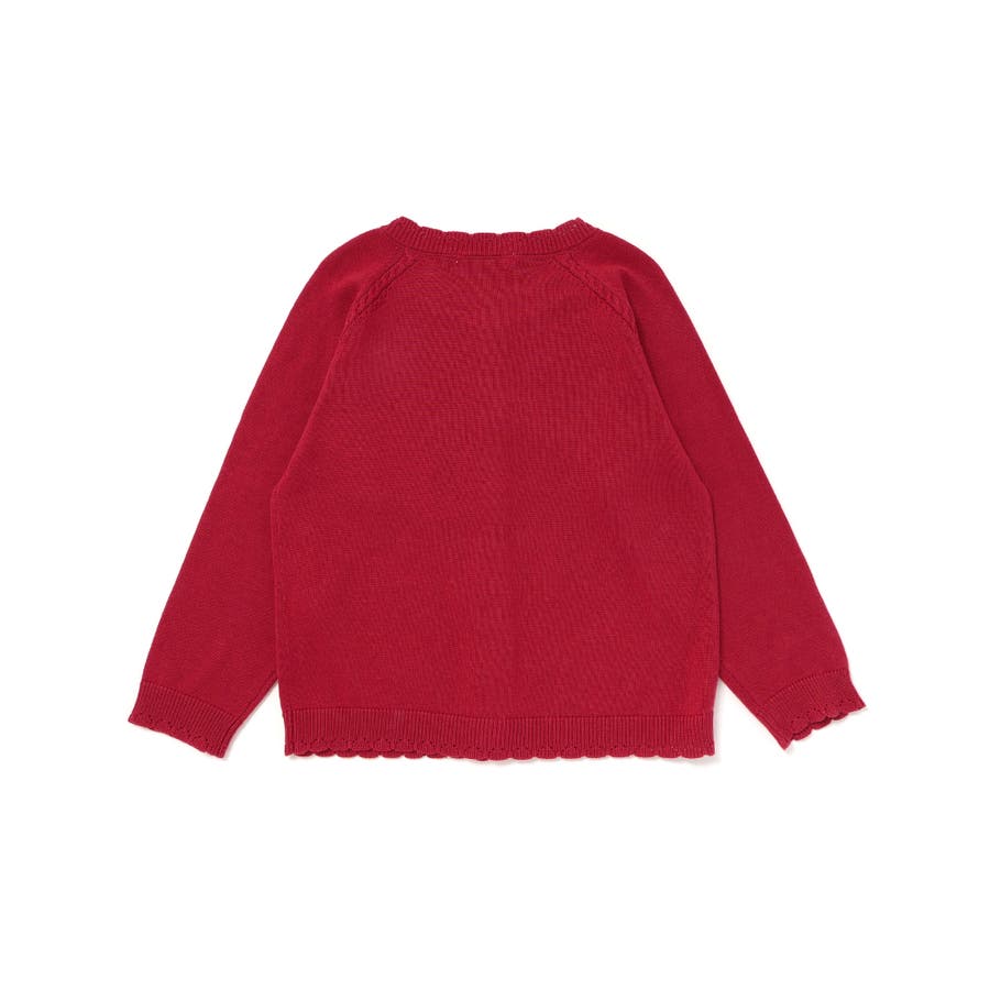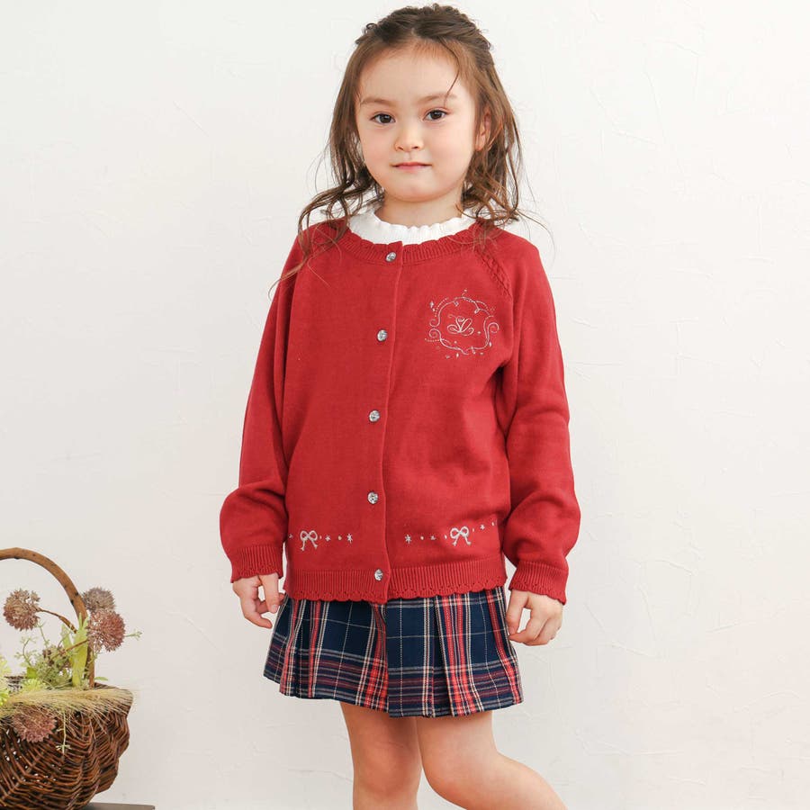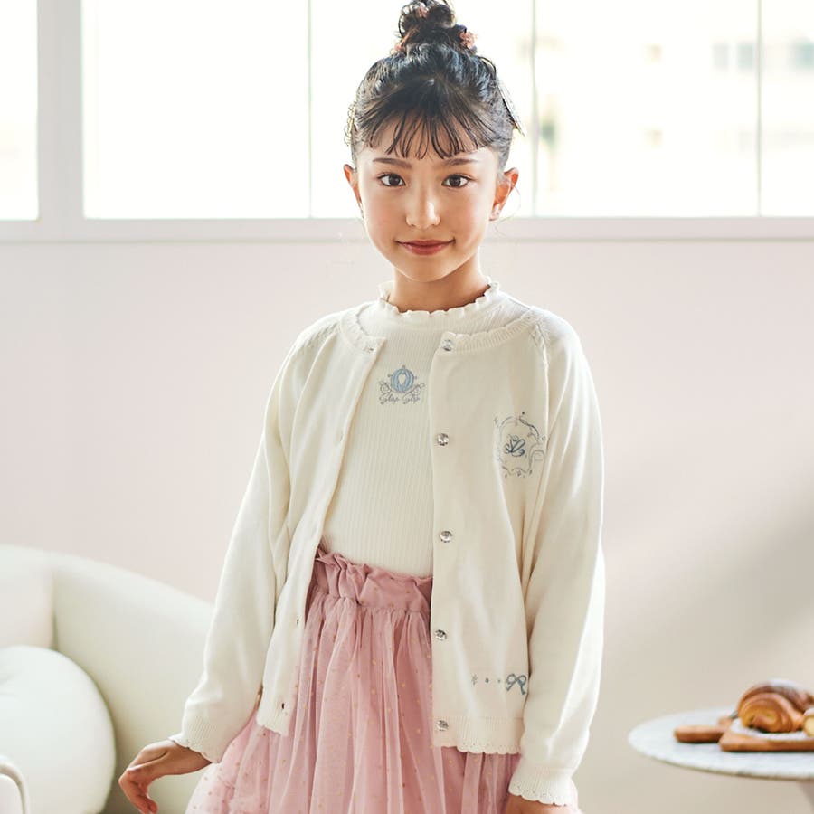 裾口や袖口のスカラップがキュートな女の子用の長袖カーディガン。