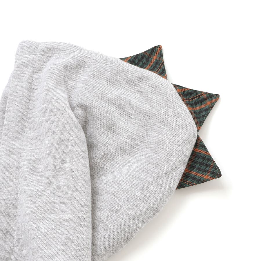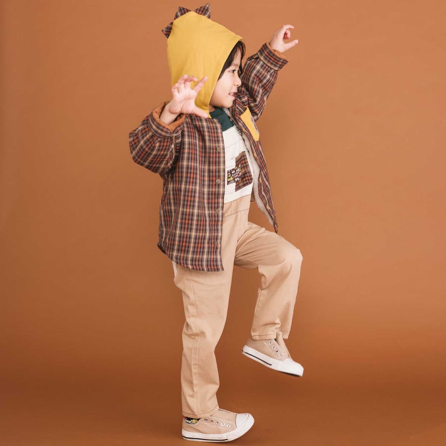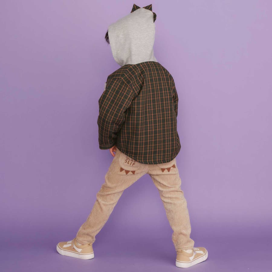 フードにはチェックの恐竜トサカ付きで、遊び心たっぷり。