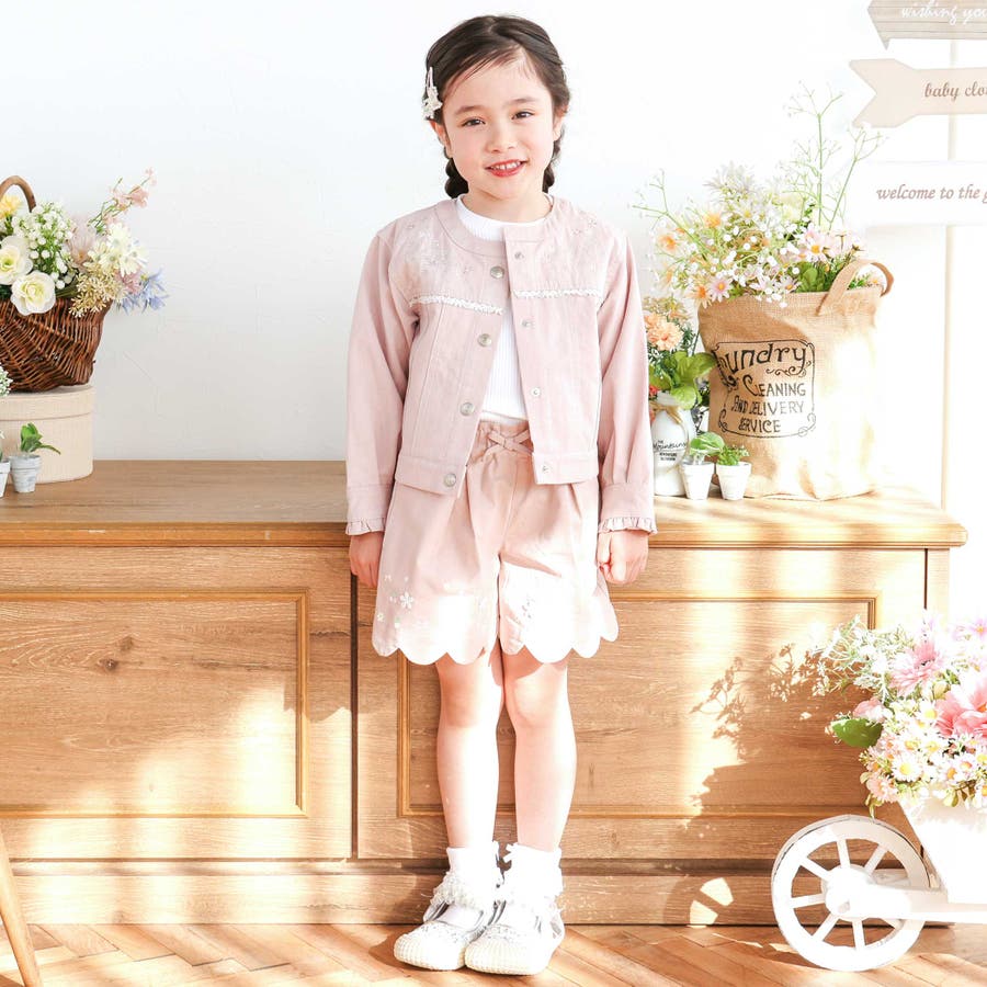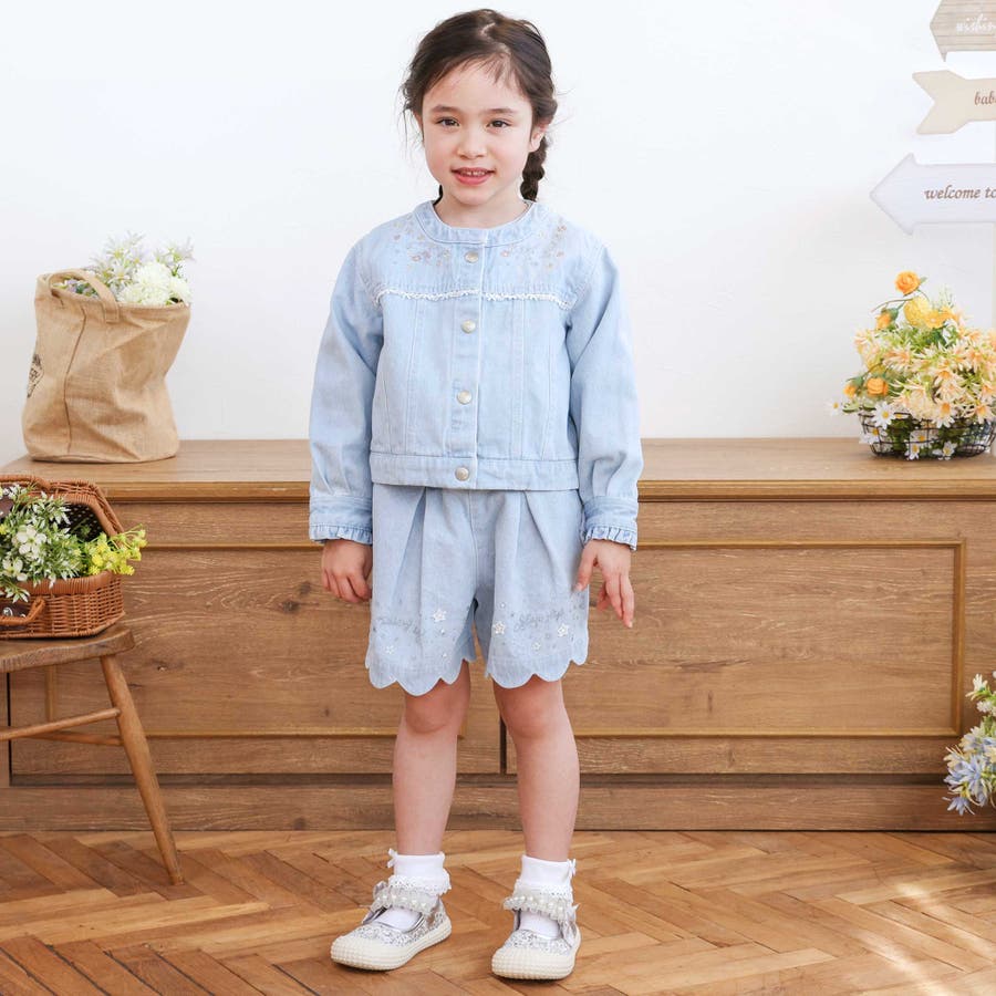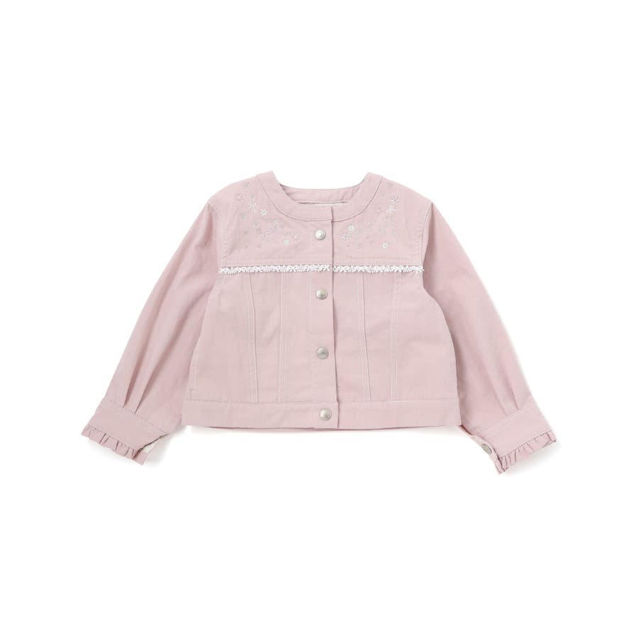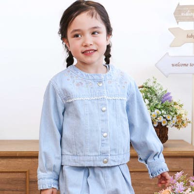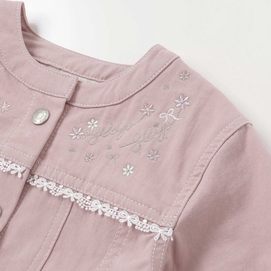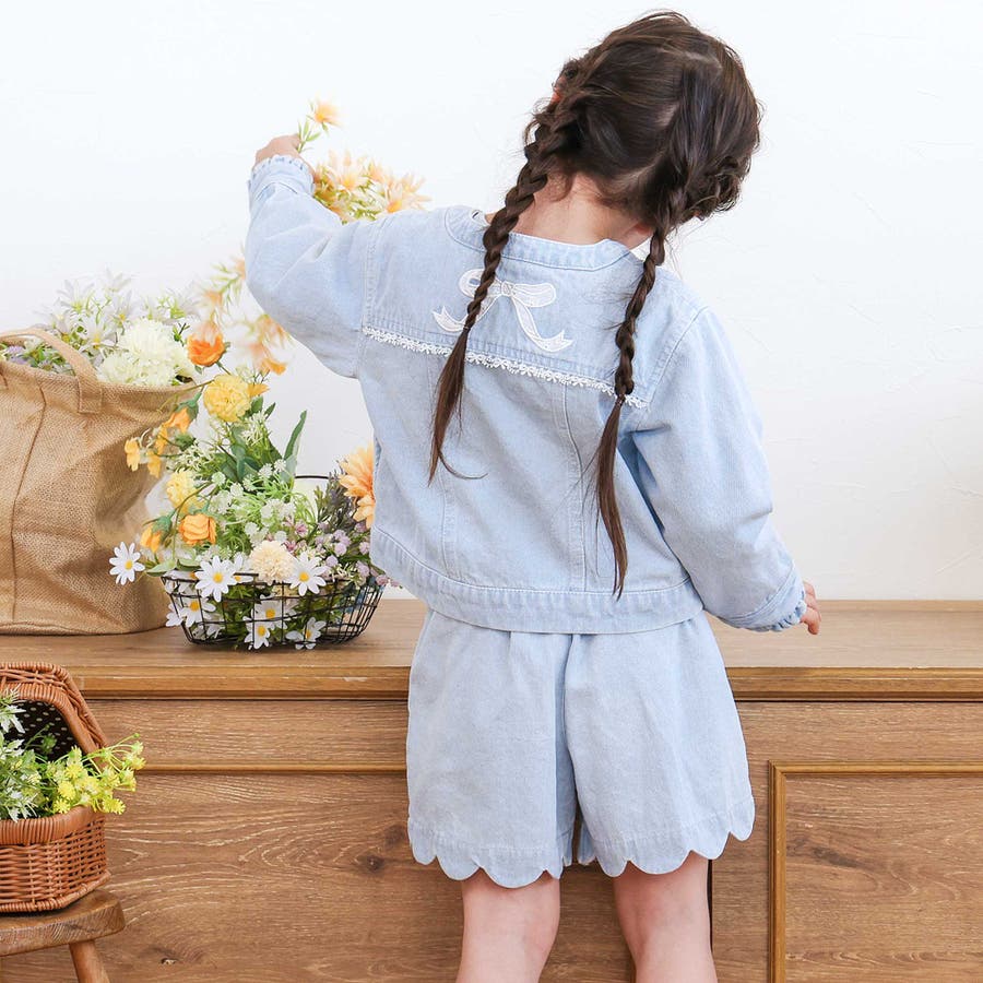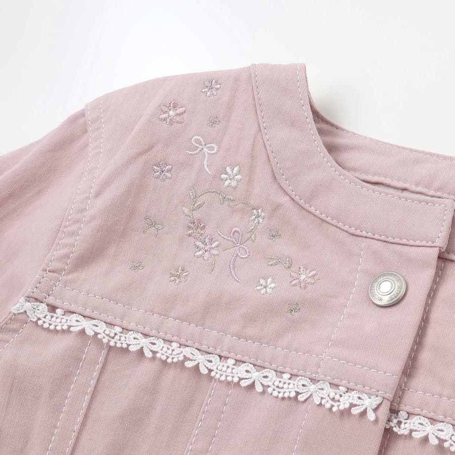 ツイルデニム後ろリボンレース刺しゅう入りノーカラージャケット(90~130cm)