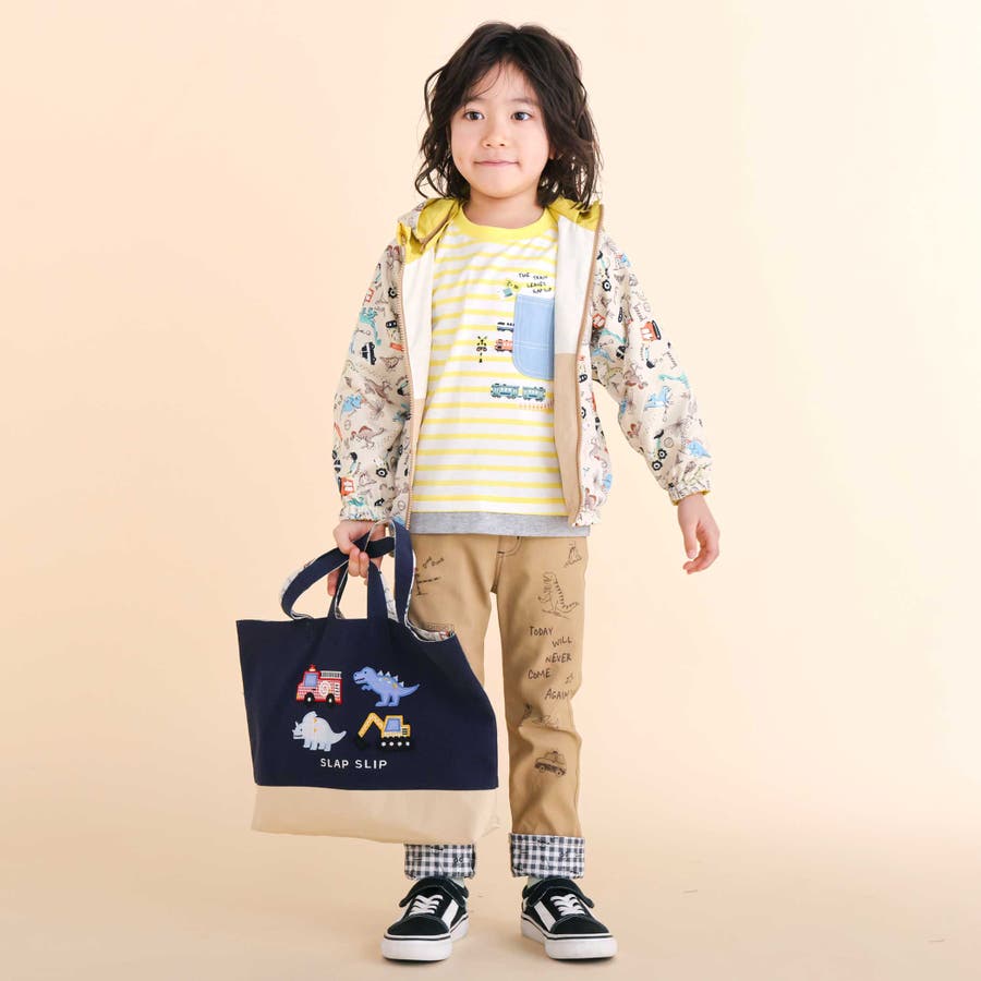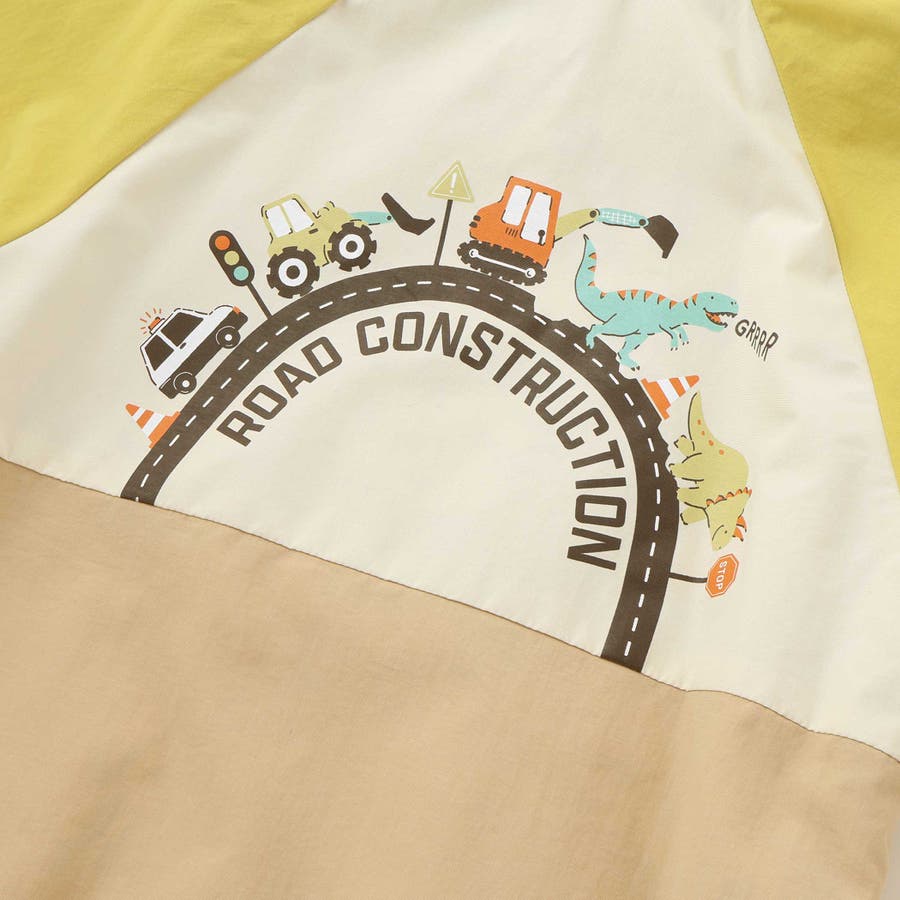 表面は、左胸元にロゴ刺しゅうを施し、後ろ身頃にはまるで道路工事中のワンシーンのような、恐竜とはたらく車のプリント入り。