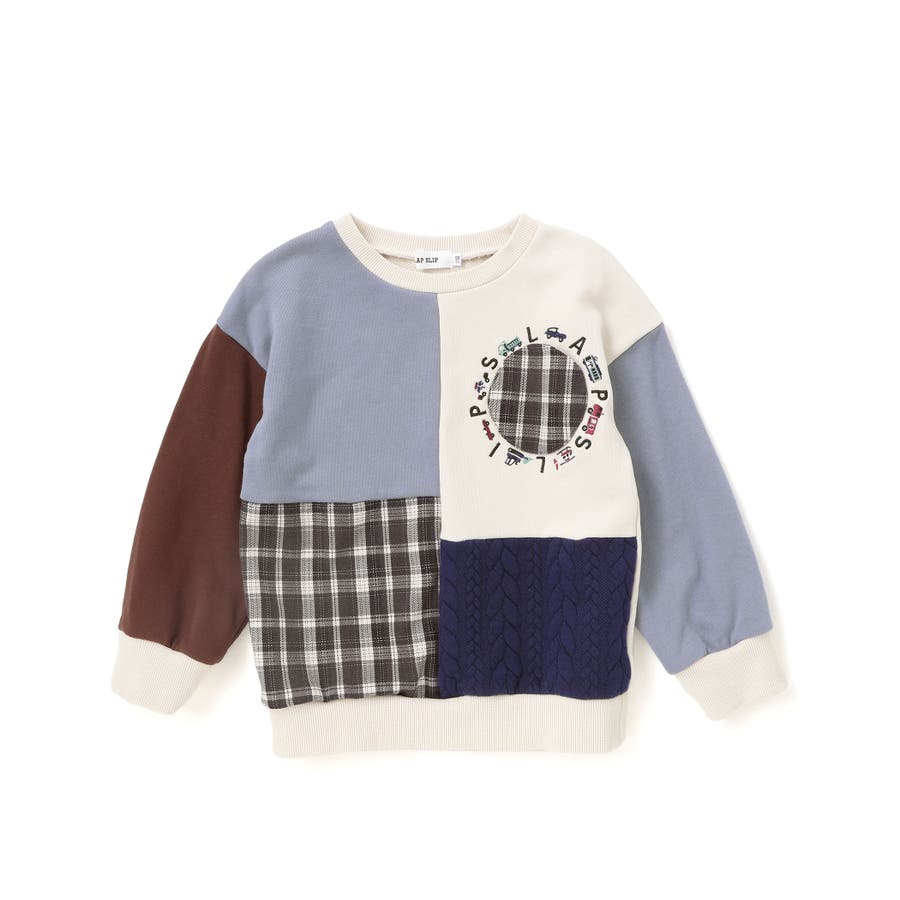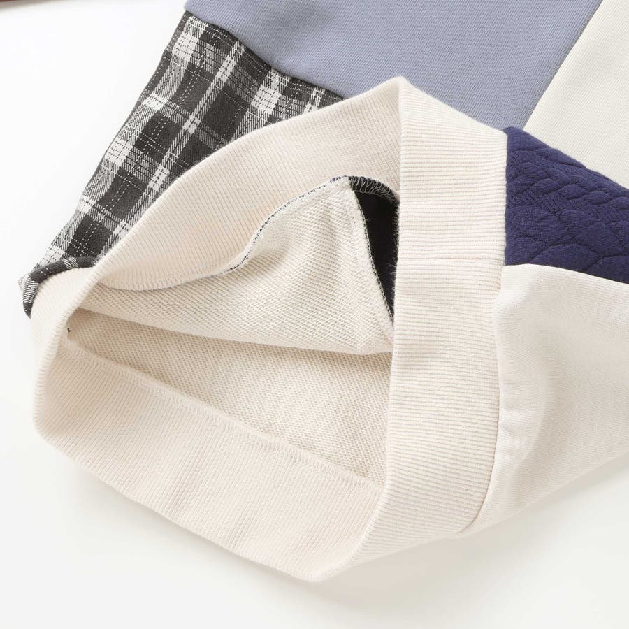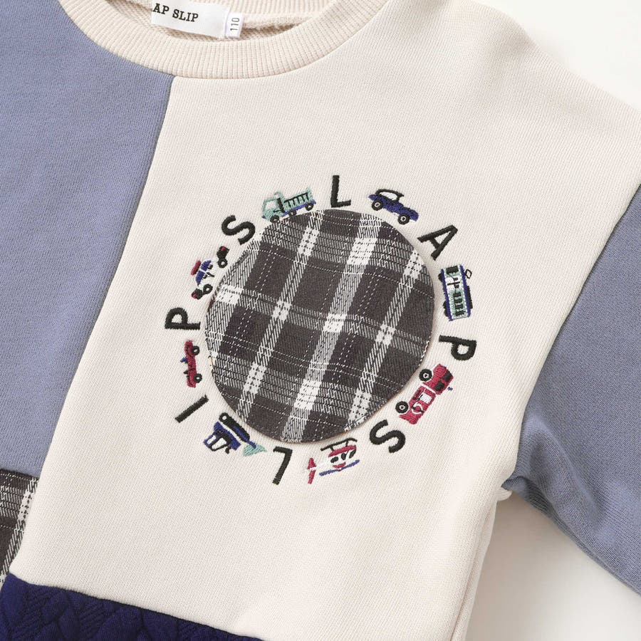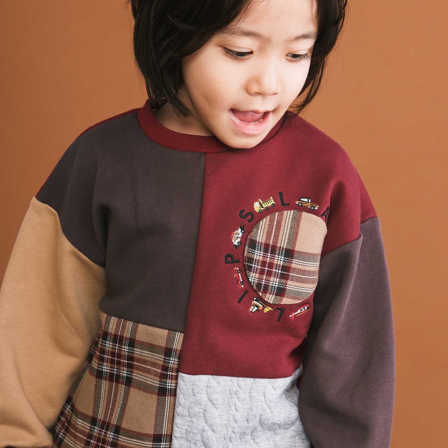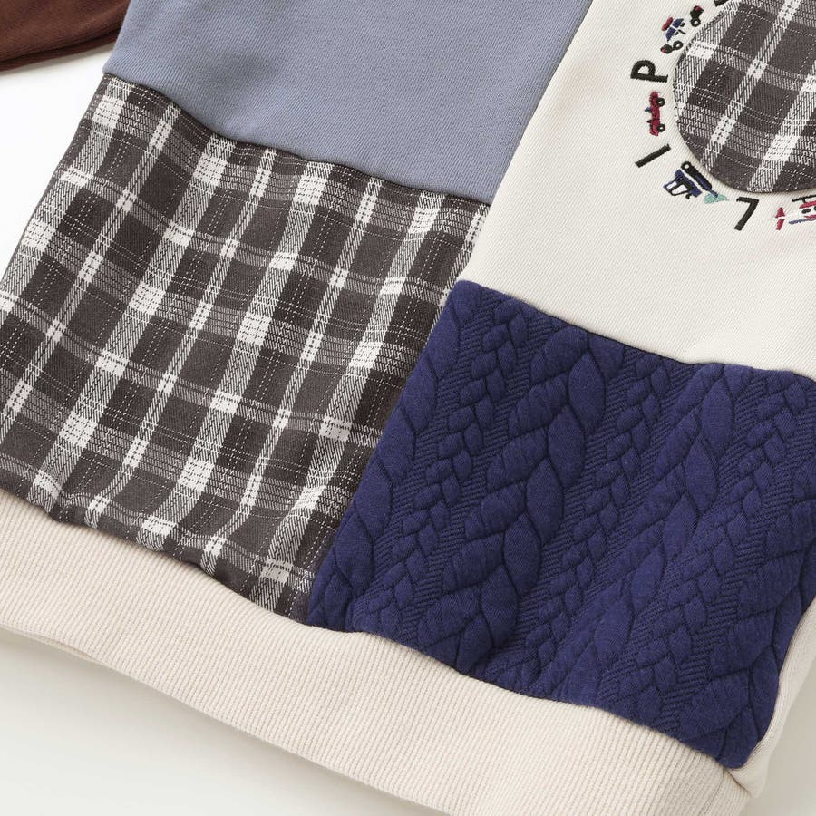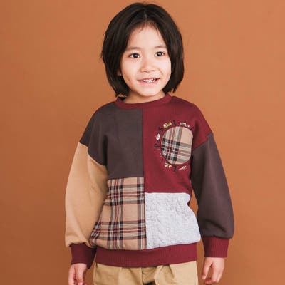 5種類の生地を切り替えた遊び心たっぷりの男の子用長袖トレーナー。