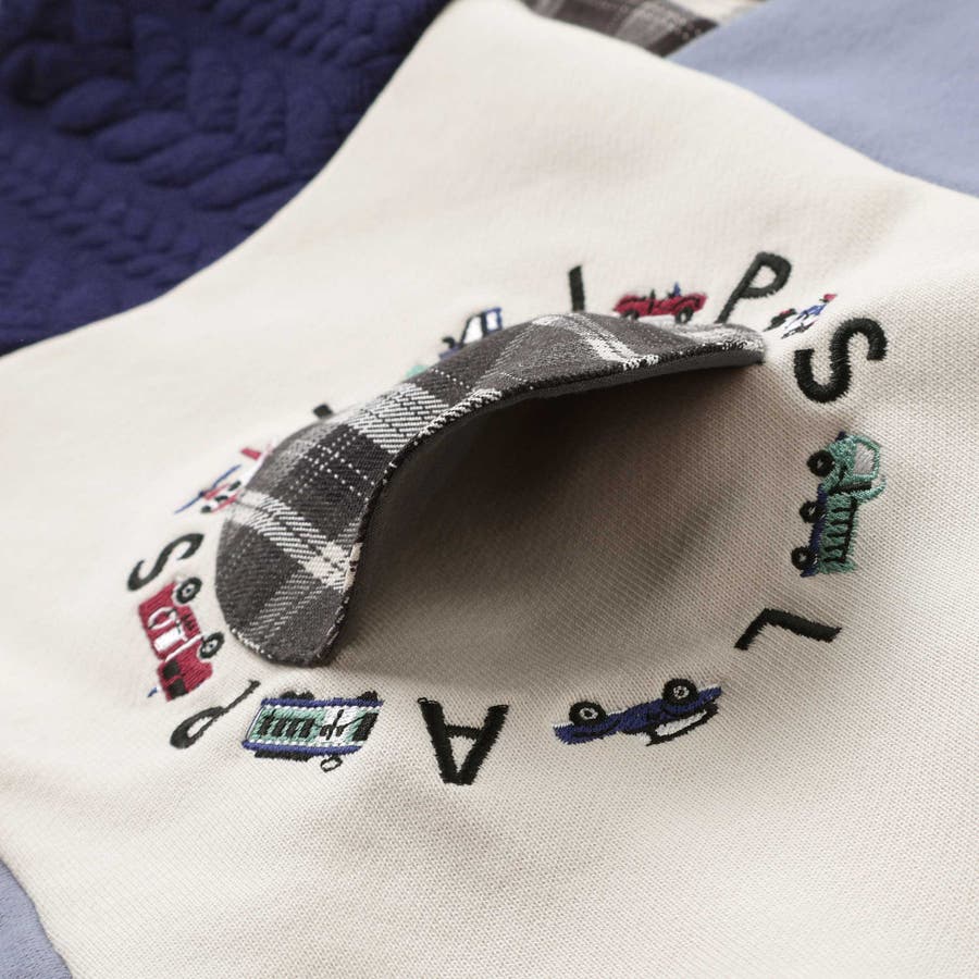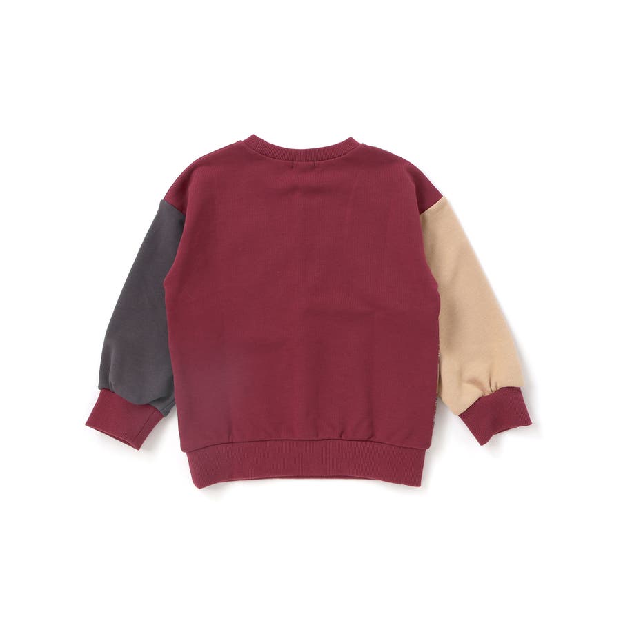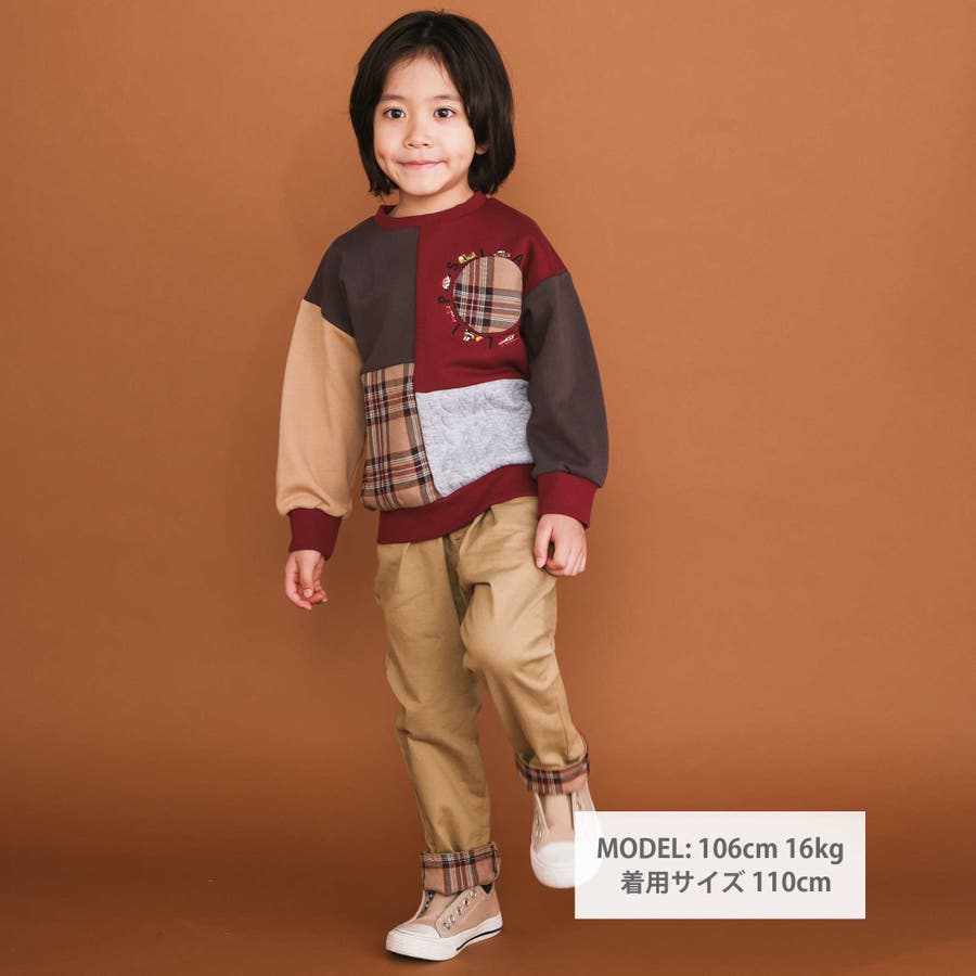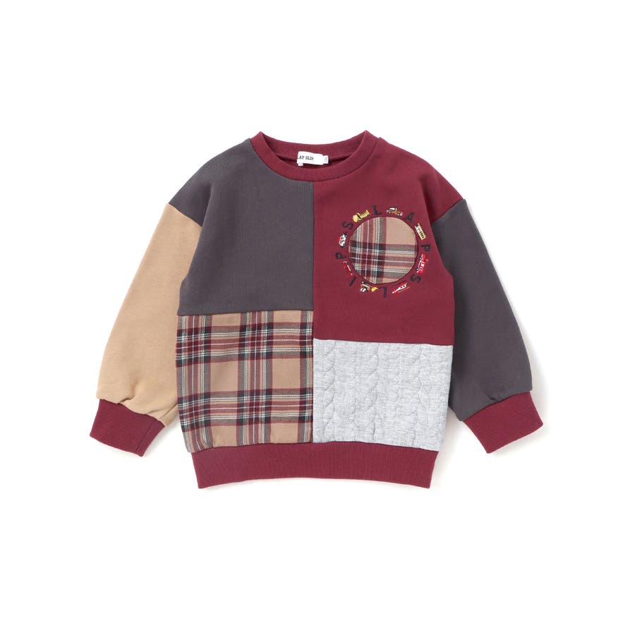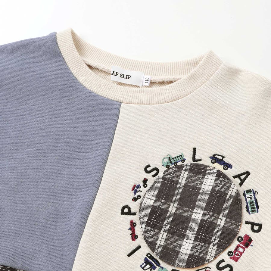 5種類の生地を切り替えた遊び心たっぷりの男の子用長袖トレーナー。