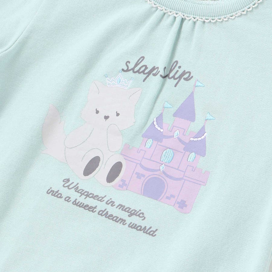 ブルー:ティアラを乗せたふさふさしっぽのネコさんとお城がオシャレ、グリーンがかったカラーが周りと差のつくオシャレな色合い