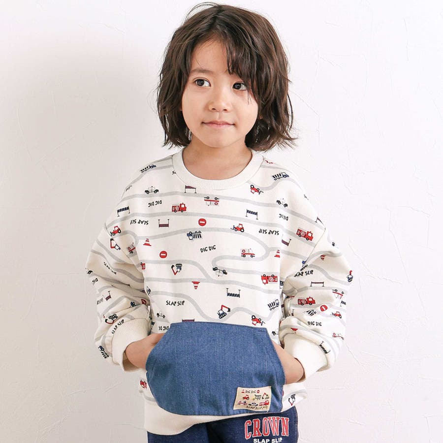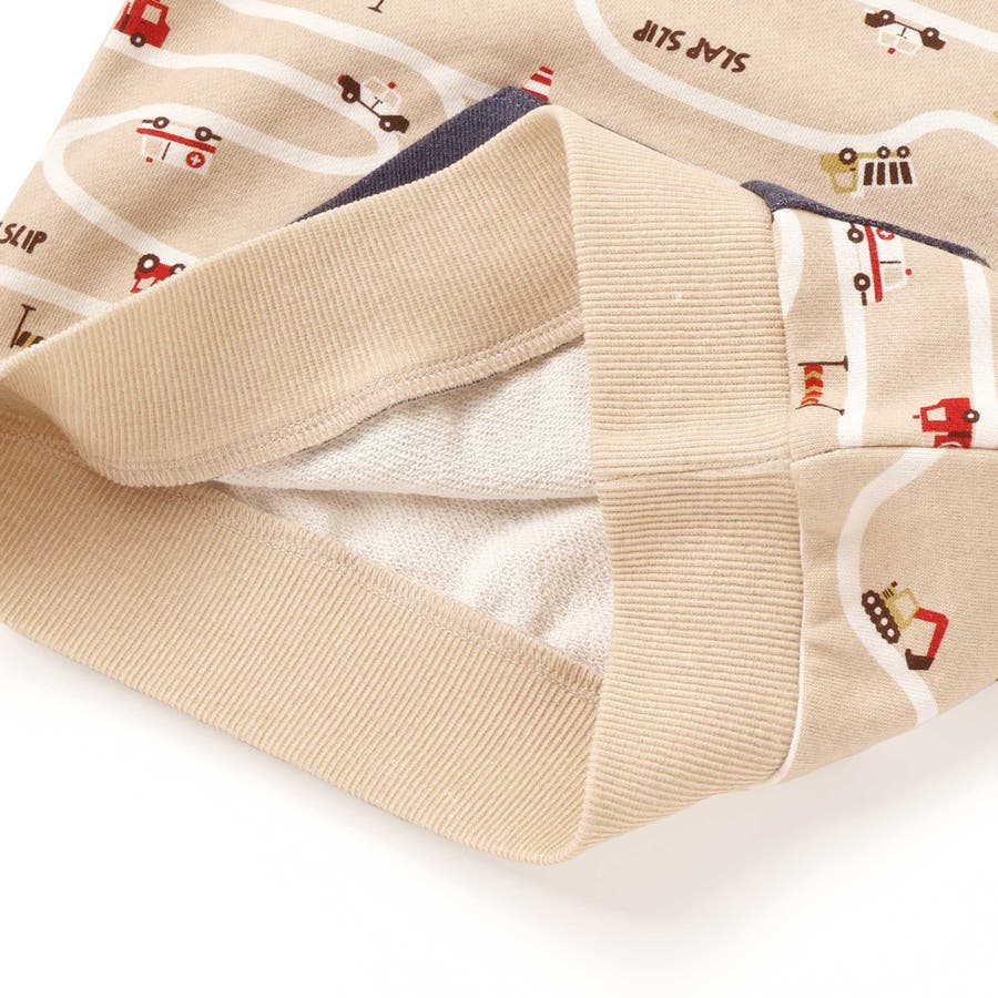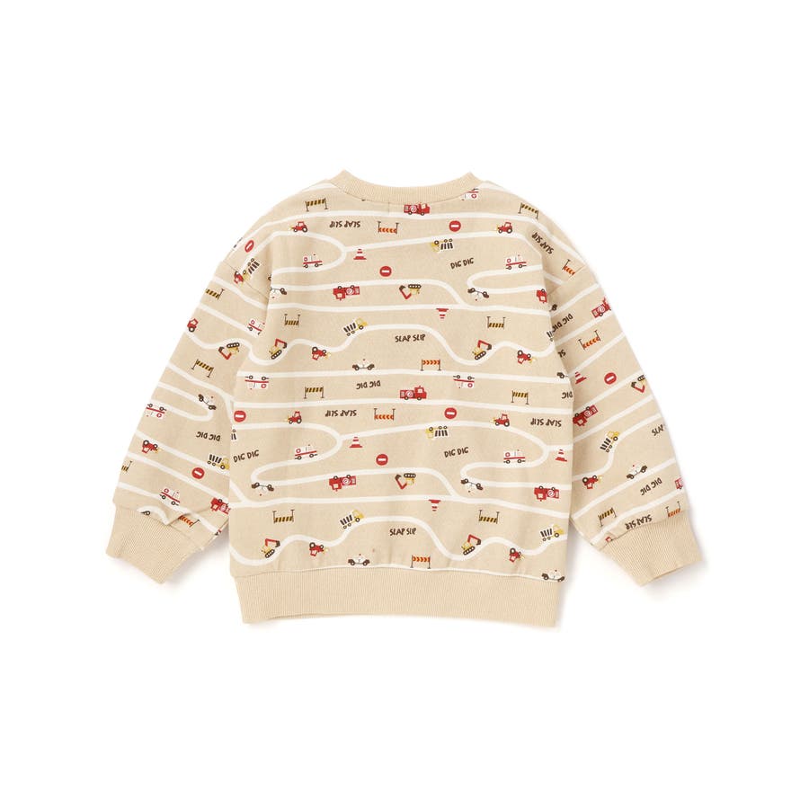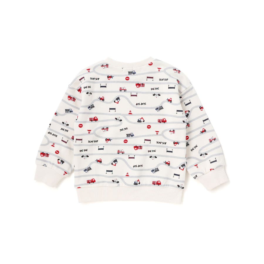 トレーナーの上をはたらくくるまがグルグル走っているような柄が遊び心たっぷり。