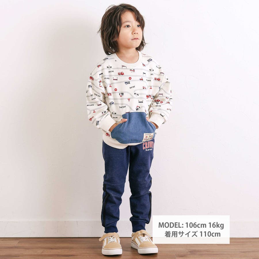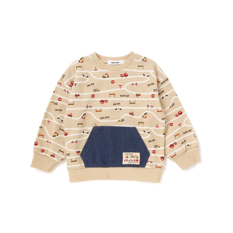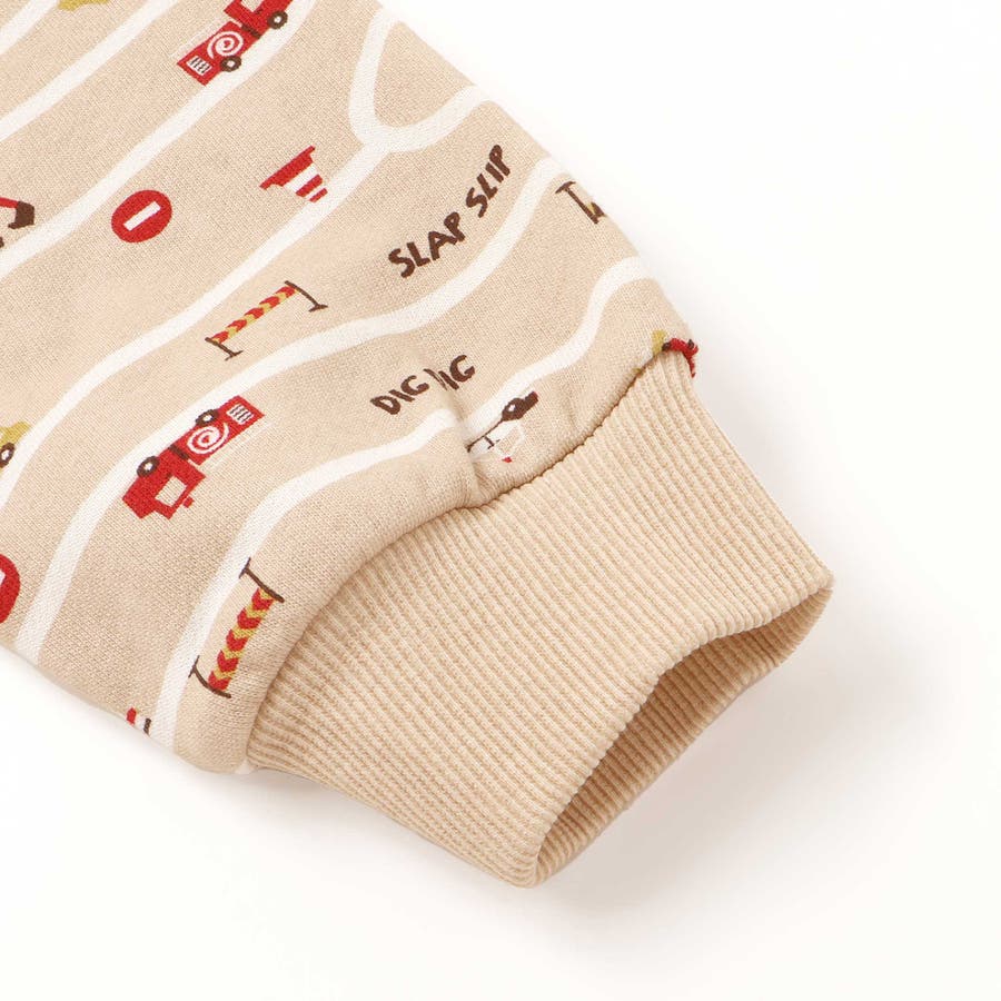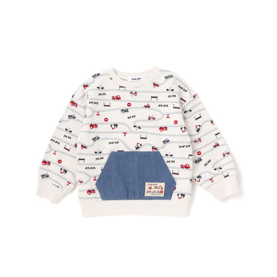 トレーナーの上をはたらくくるまがグルグル走っているような柄が遊び心たっぷり。