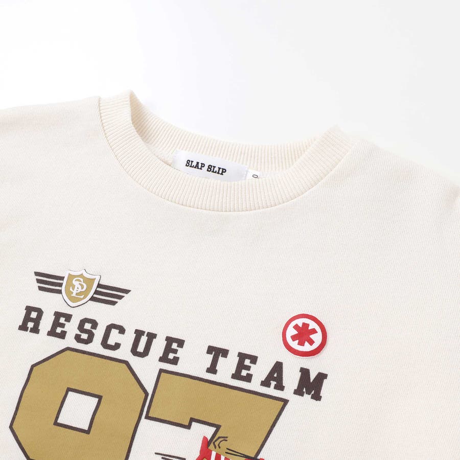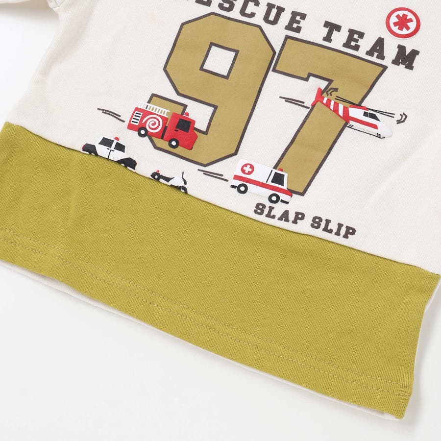 フロントにはパトカーに消防車、ドクターヘリなどのレスキューチームがブーンと走り抜けるような疾走感のあるプリントをオン!