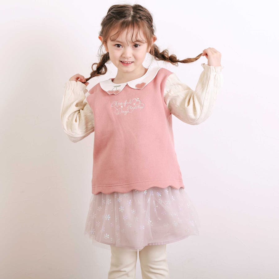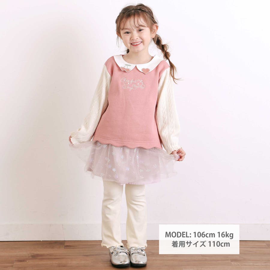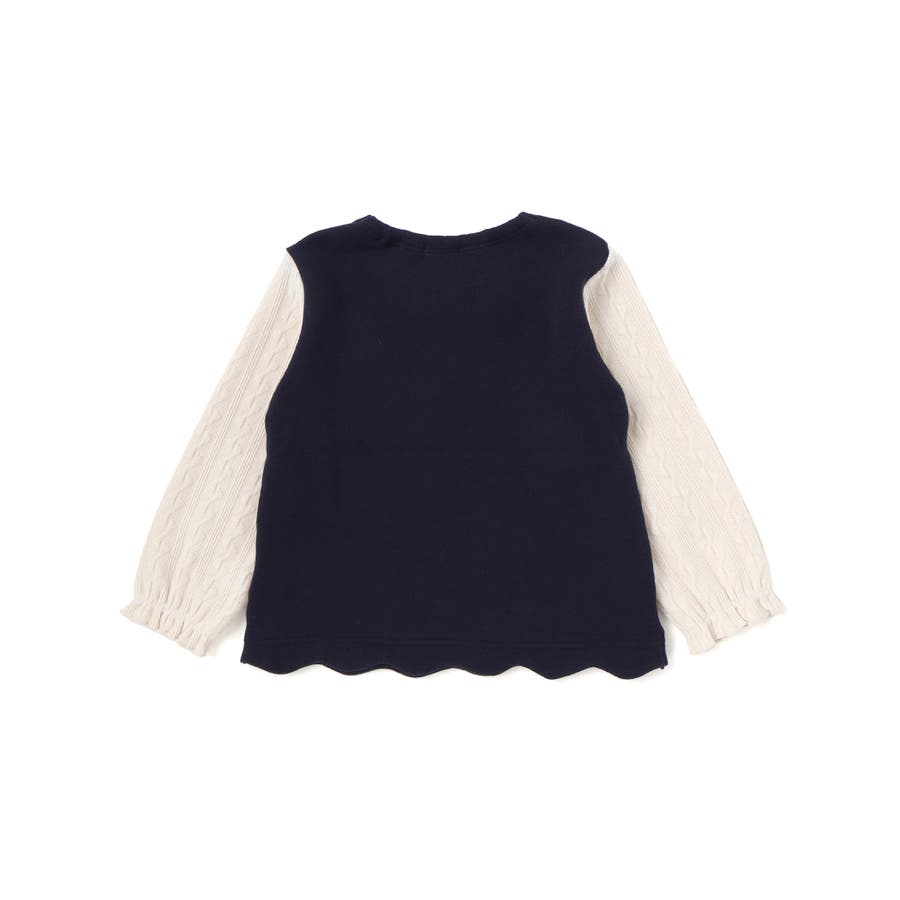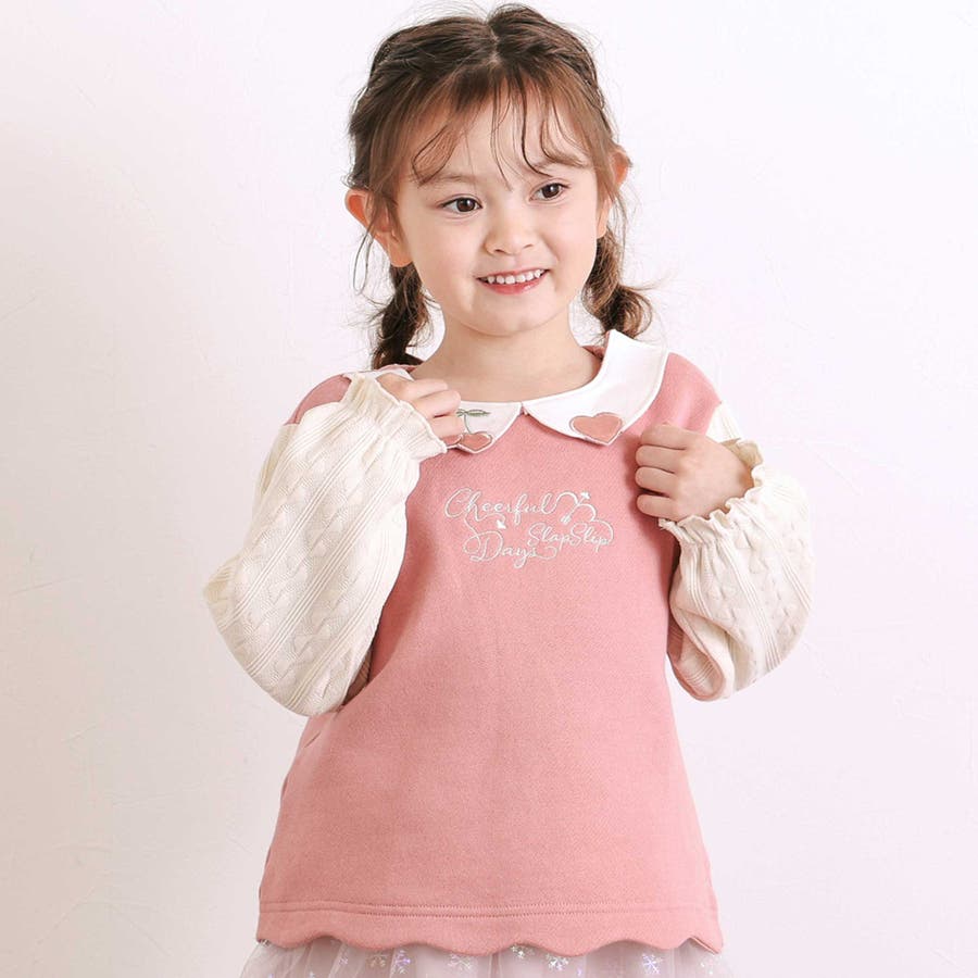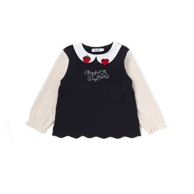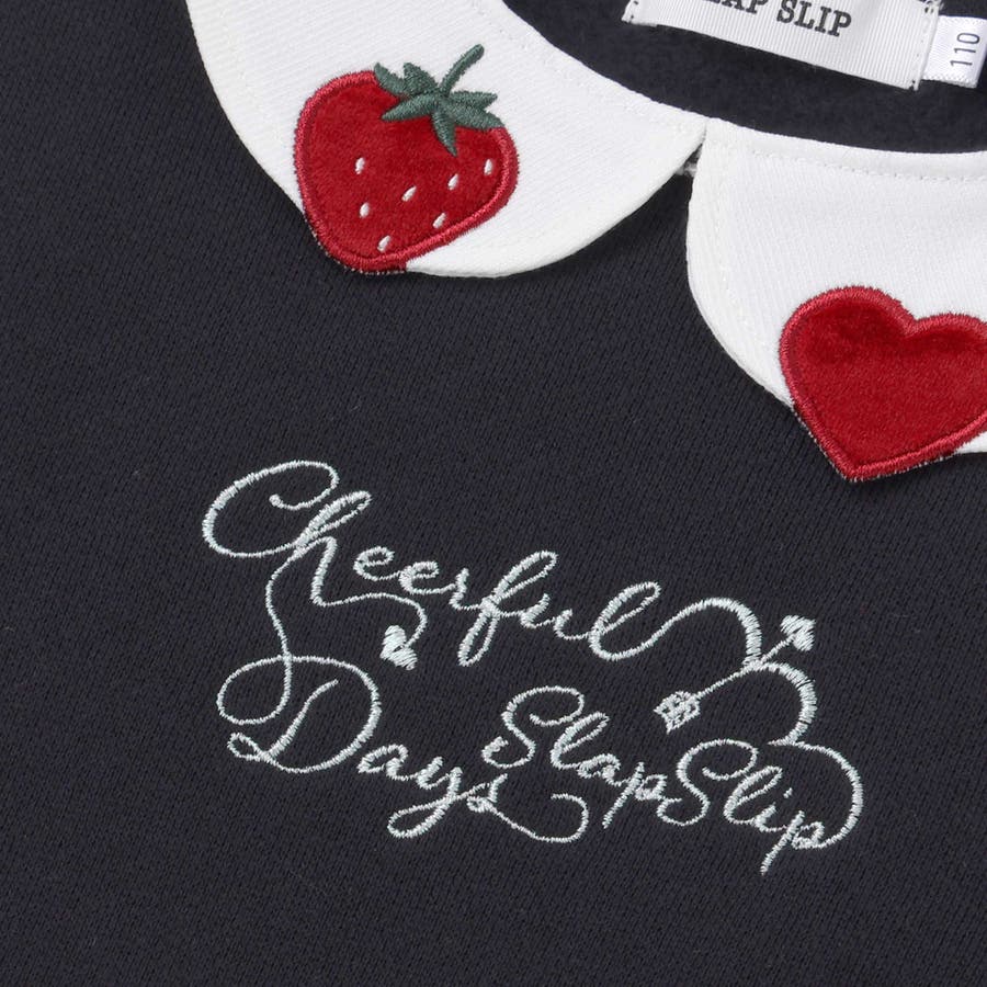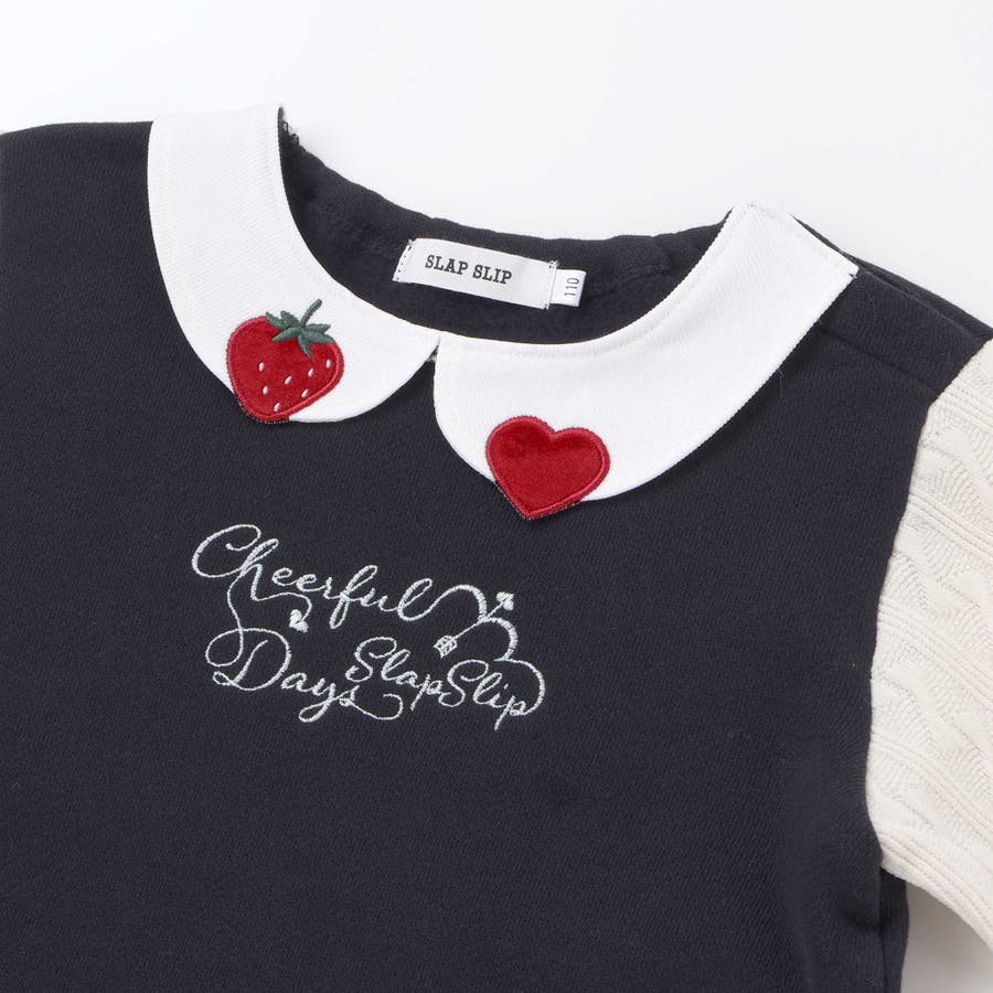 【裏起毛】ハートチェリーイチゴ刺しゅう襟付き袖切り替え裾スカラップトレーナー(8…