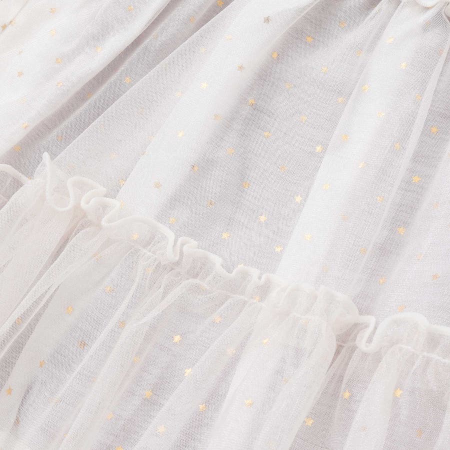 チュールと星刺しゅうの華やかなディテールが、贈り物としても喜ばれる一枚。