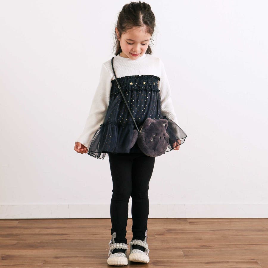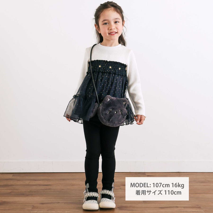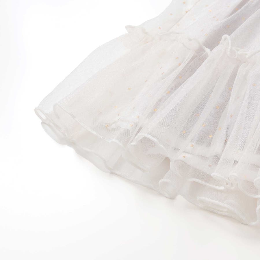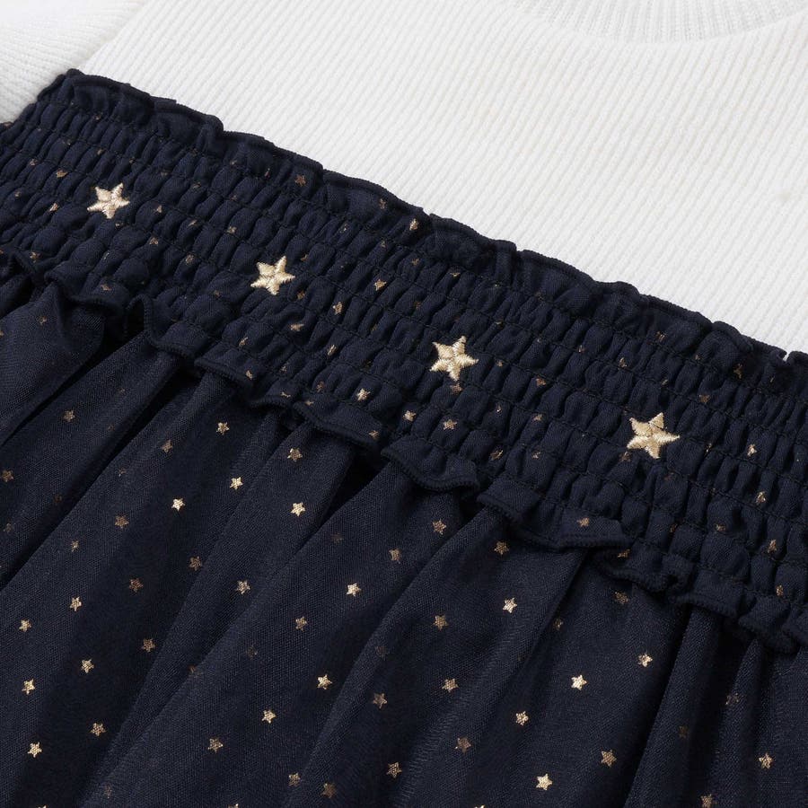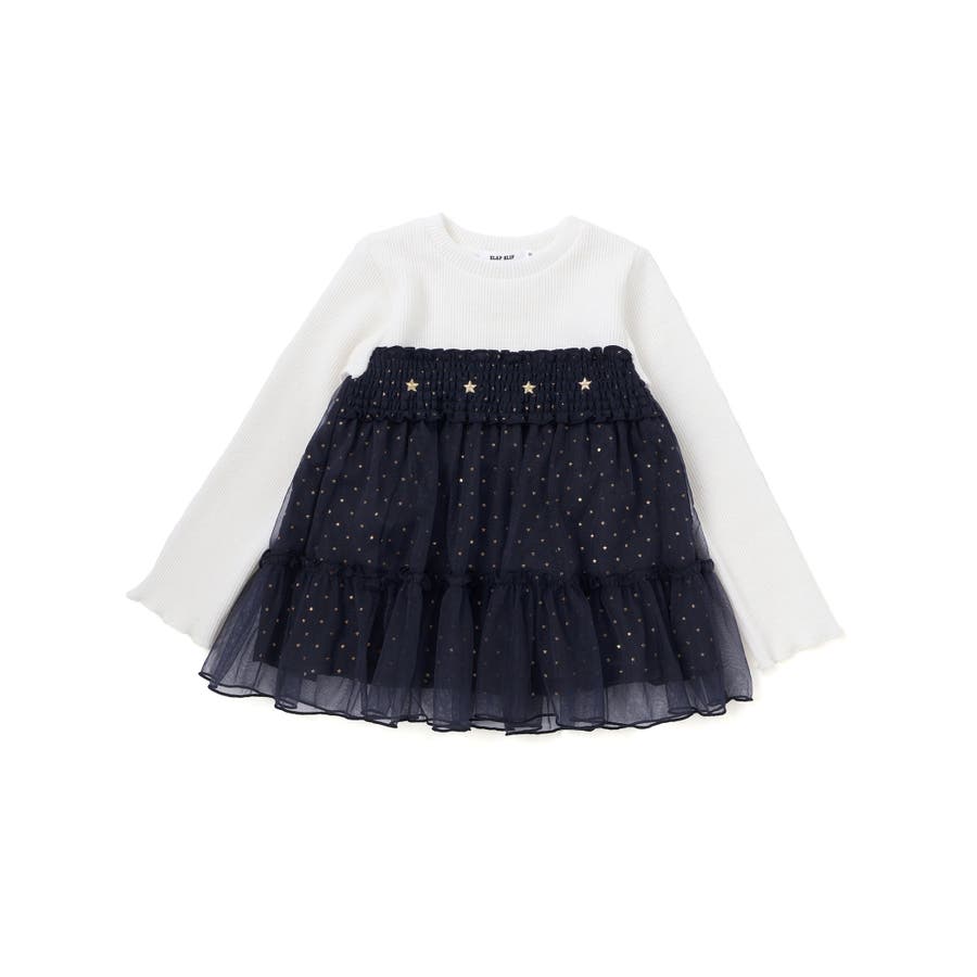 ふんわり広がる裾の切り替え部分は内側にキラキラの星柄、ふんわりチュールを重ねた華やかなデザイン。