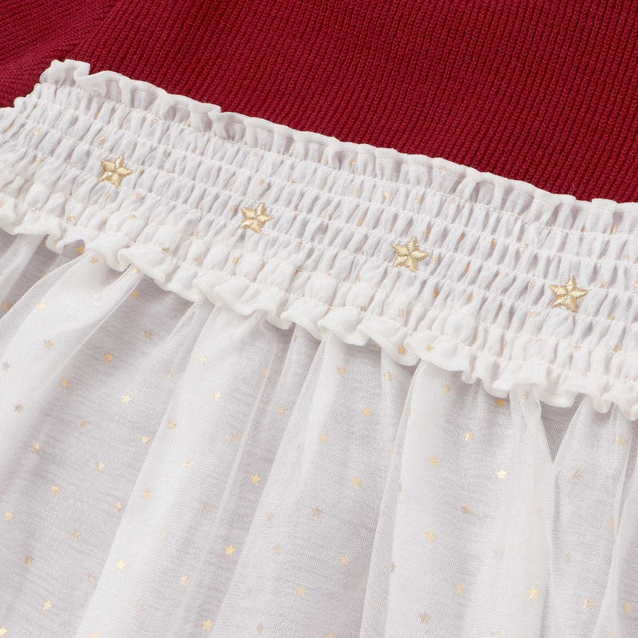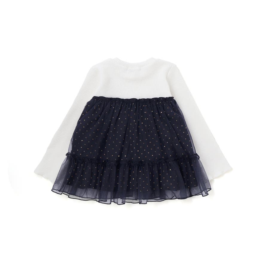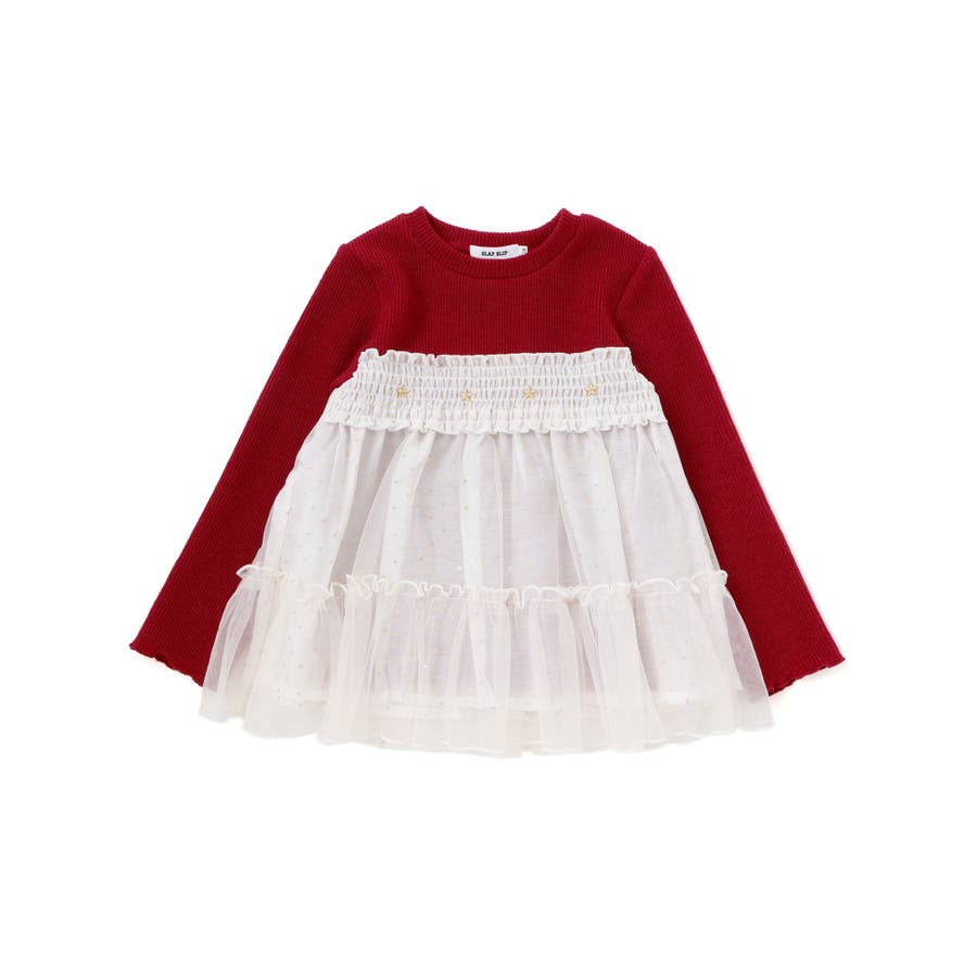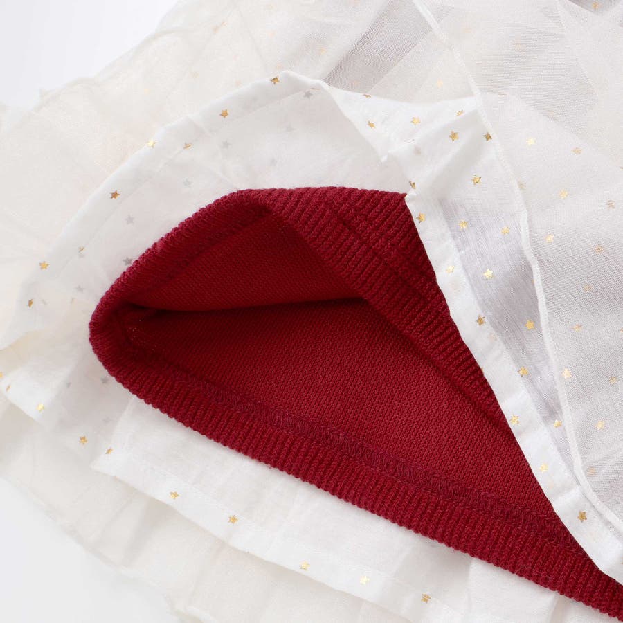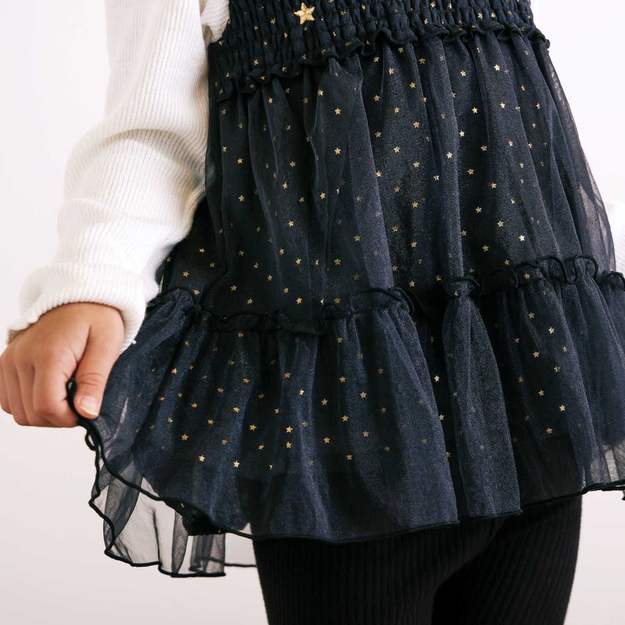 ふんわり広がる裾の切り替え部分は内側にキラキラの星柄、ふんわりチュールを重ねた華やかなデザイン。
