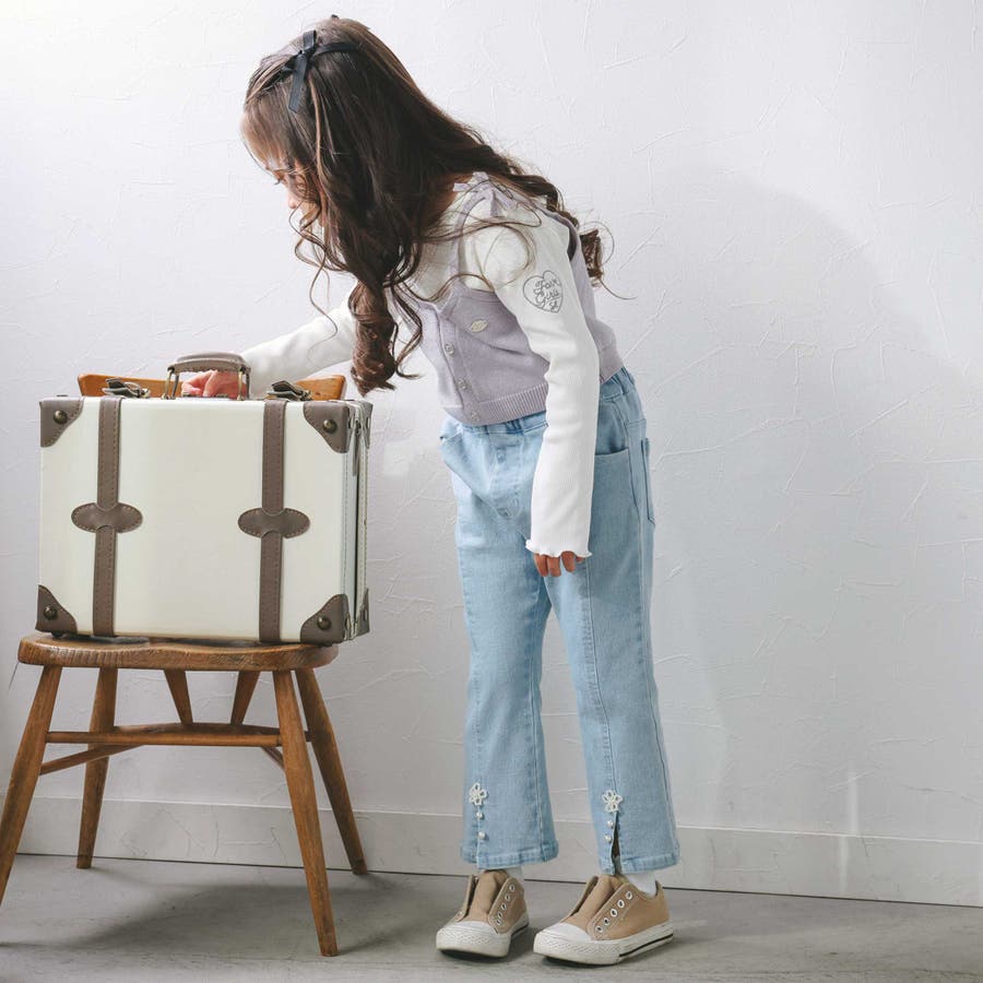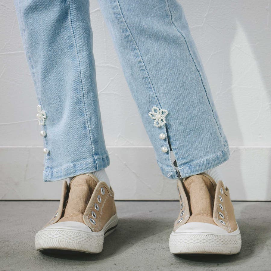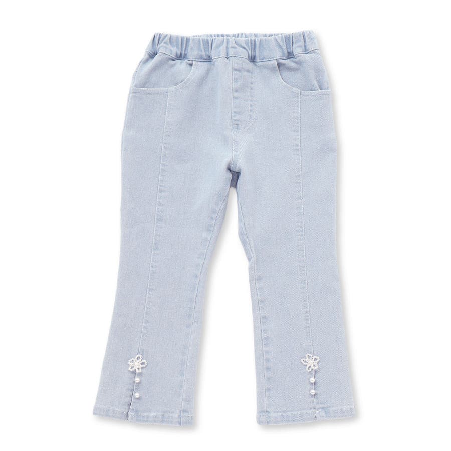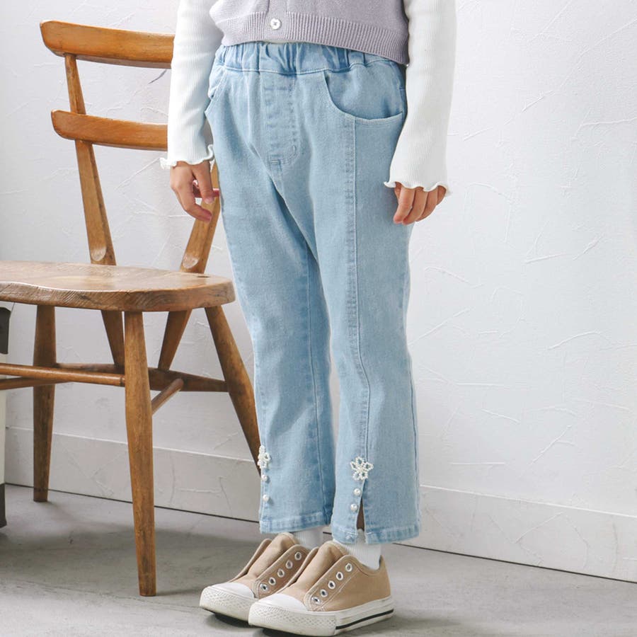裾スリットパール花付きツイルデニムパンツ(90~130cm)