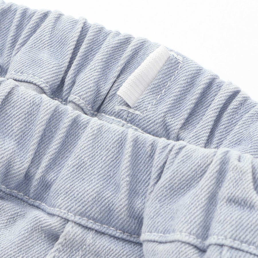 ブルー:デニム素材を使用。カジュアルになりがちなデニムパンツにフェミニンさをプラス