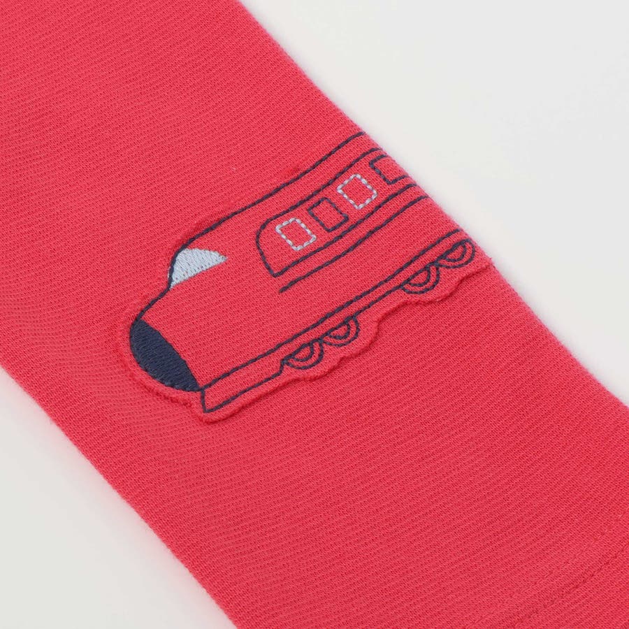 レッド:パッと目を引くレッドの生地に電車の膝パッチ