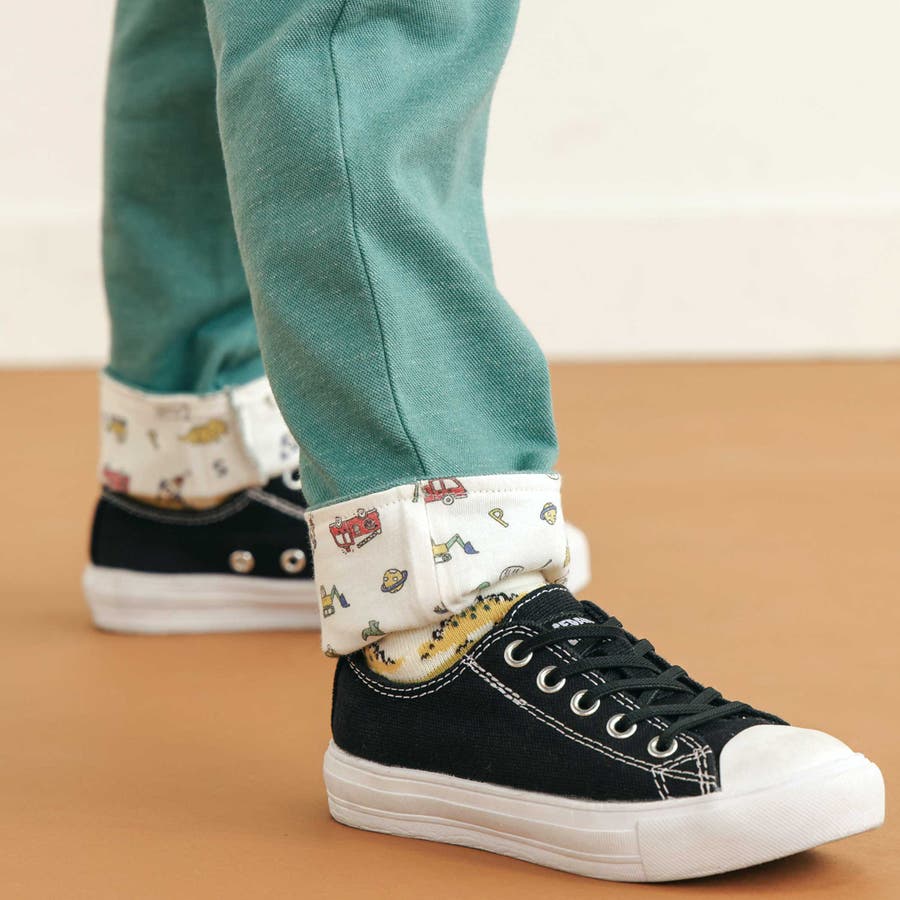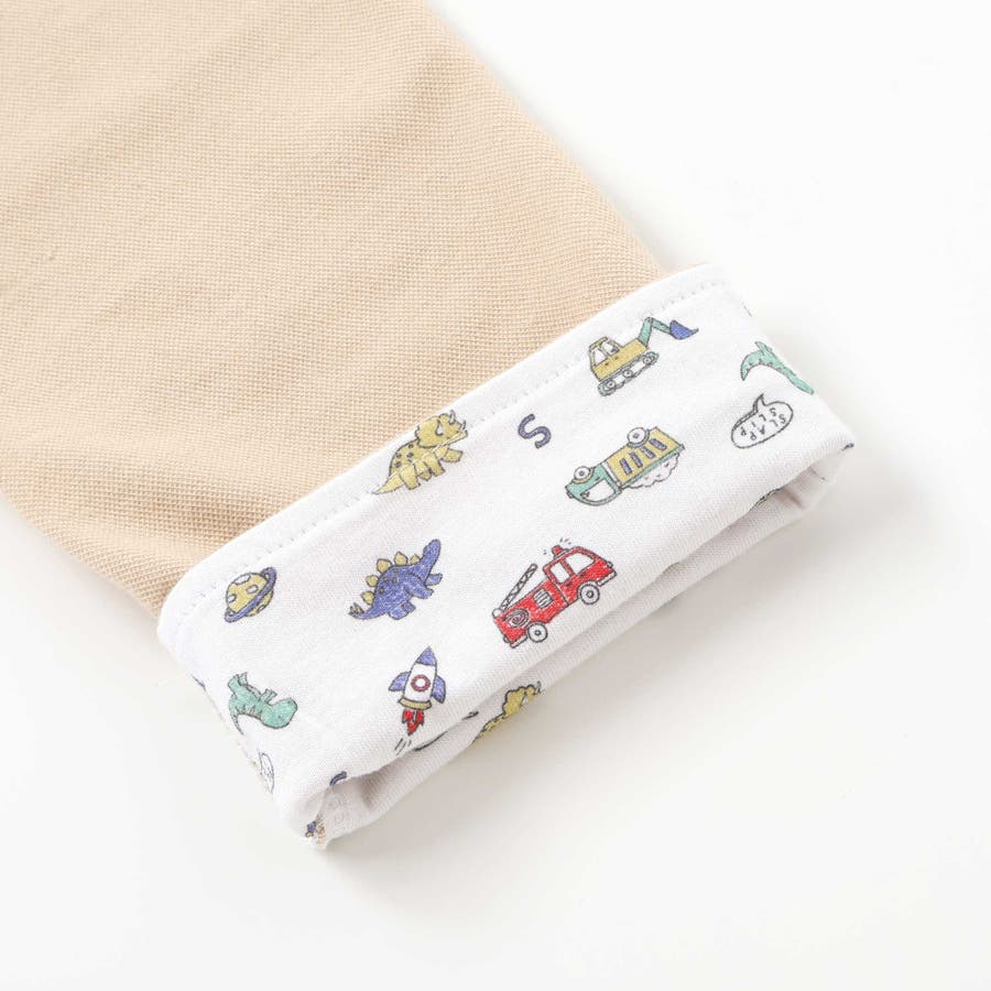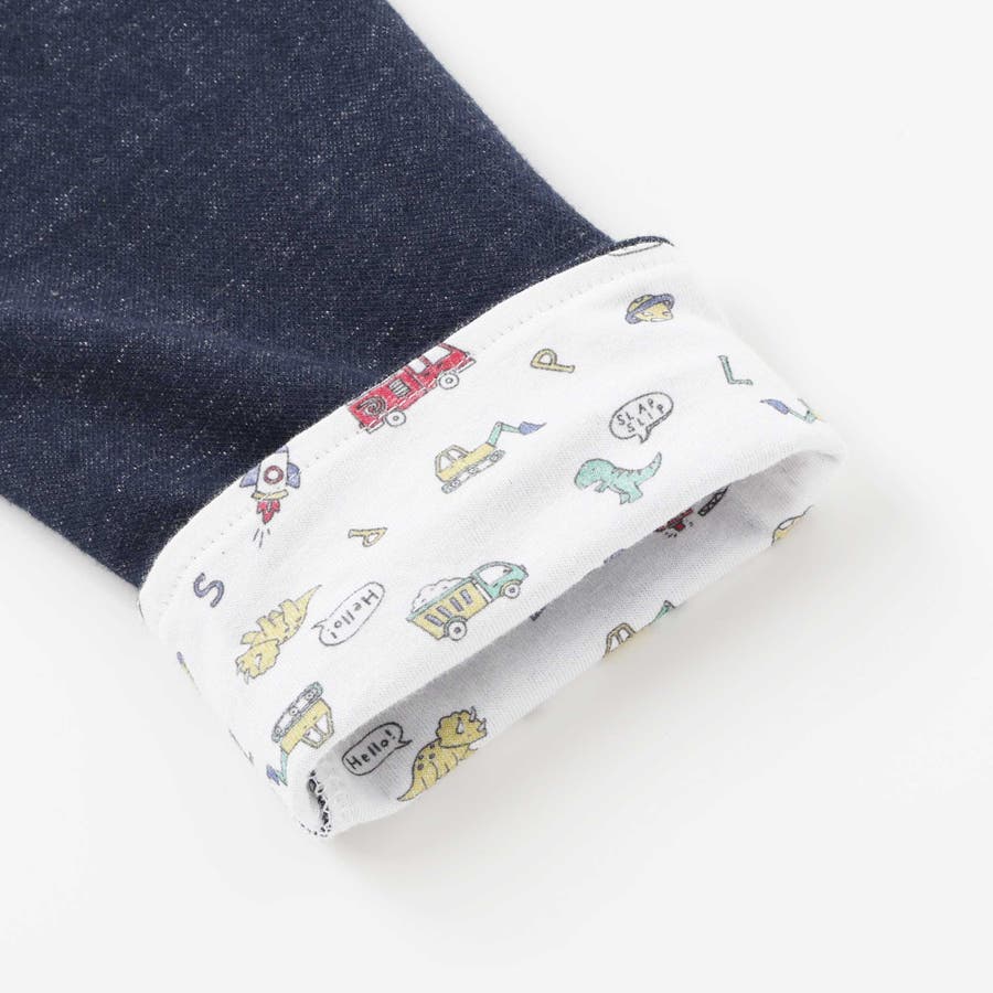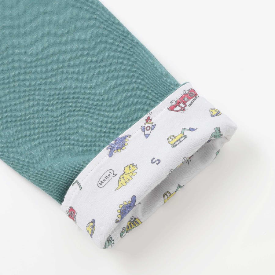 裾を折り返すとはたらくくるまに恐竜男の子の大好きをギュギュと詰め込んだプリント柄になっているので大きめサイズを買って折り返してはくのも◎
