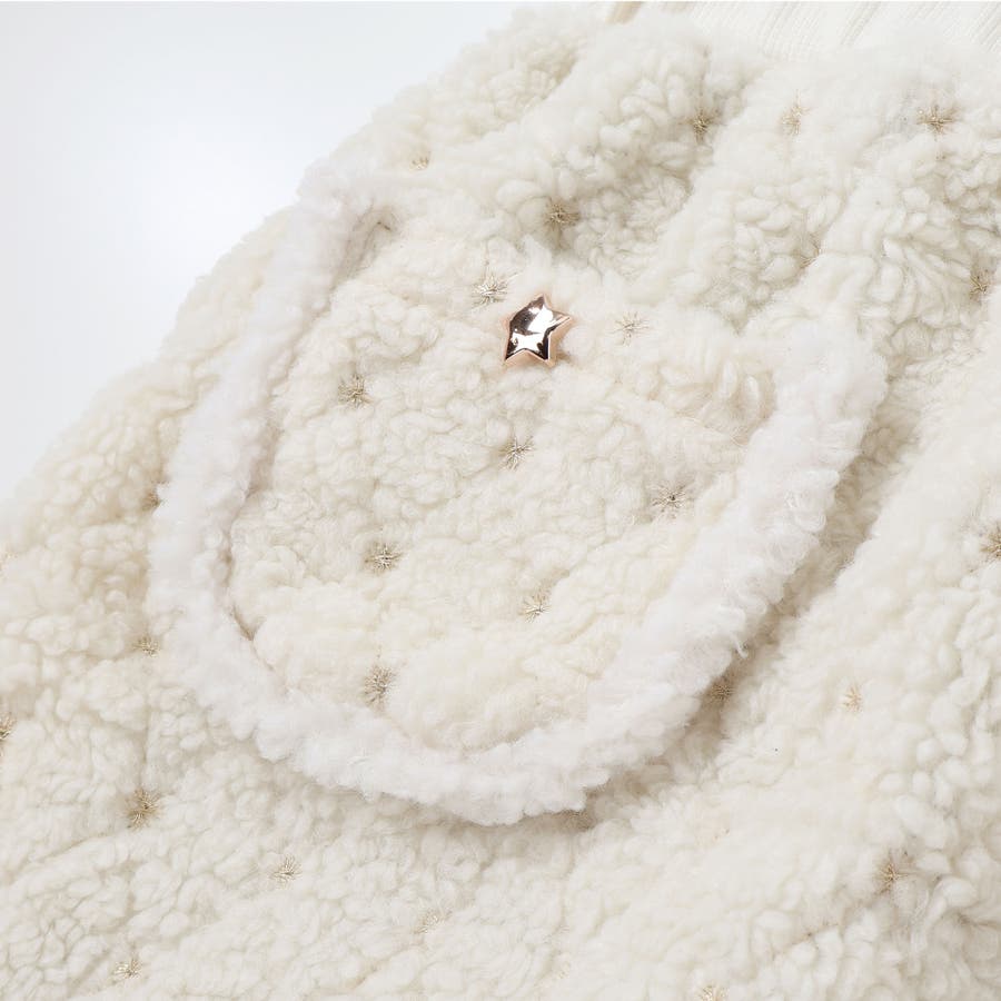 細部までこだわった刺しゅうとボア素材、ゴールドの星ボタンが女の子らしい華やかさをプラス。