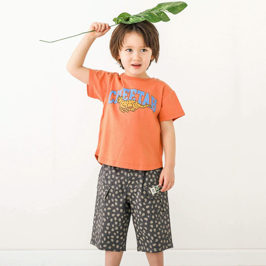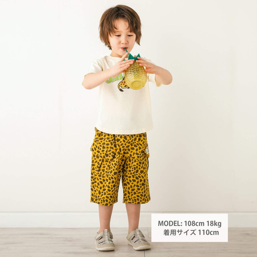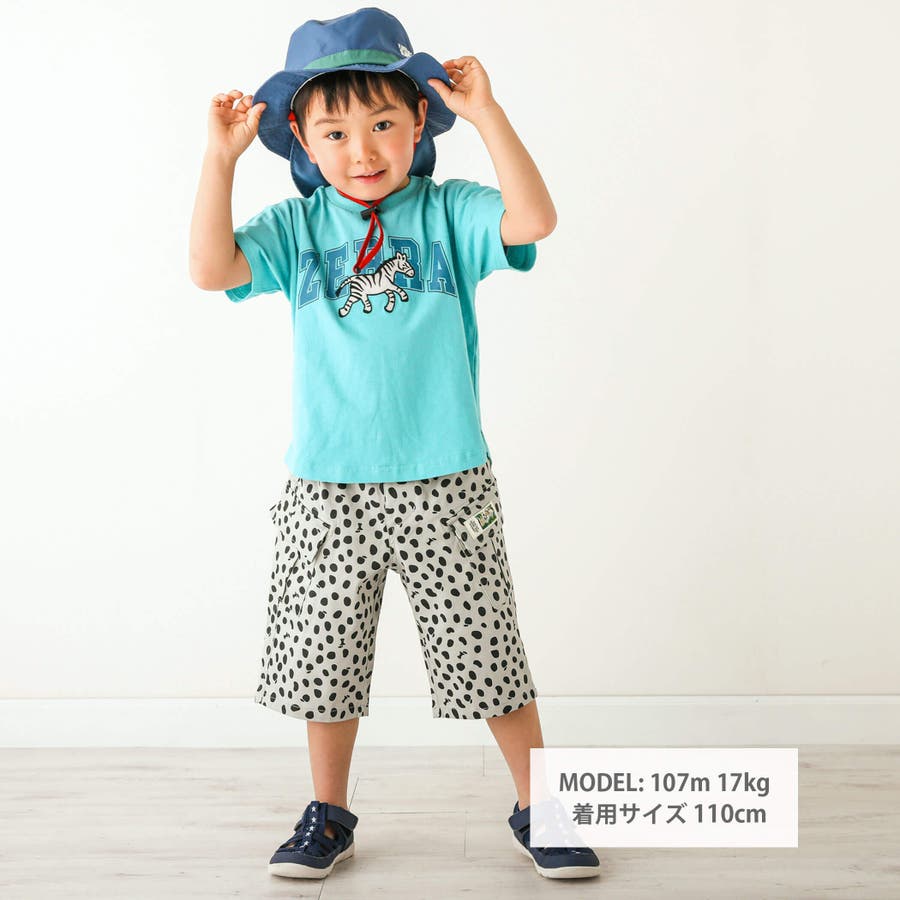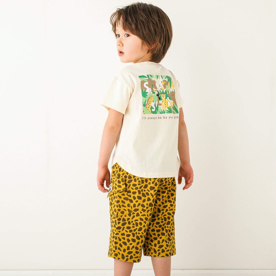 あどけない表情のアニマルのパッチ刺しゅうが印象的な半袖Tシャツ(1815-53159)をスタイリングした男の子が大好きなアニマルコーデがオススメ。