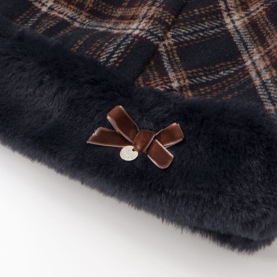 裾はふんわりファー切り替えで季節感を演出し、左端にはベロアリボンとチャームを添えて、歩くたびにさりげなく揺れる可愛らしいデザインに仕上げました。