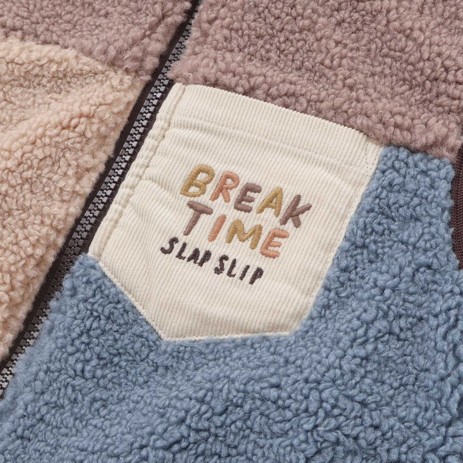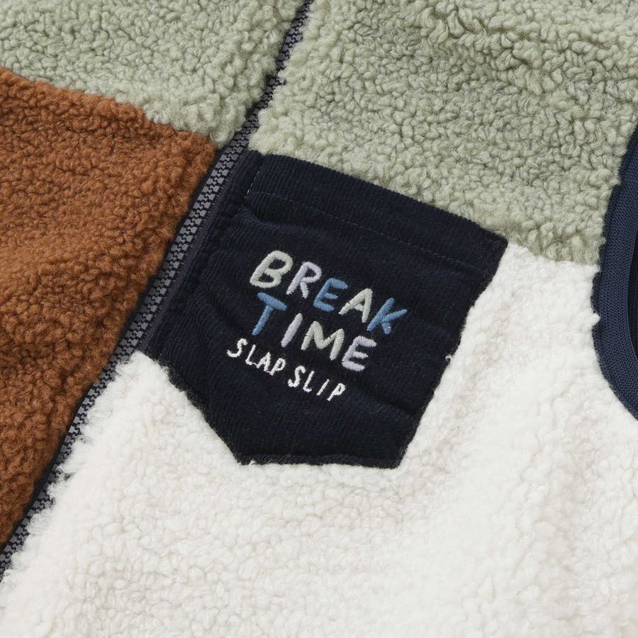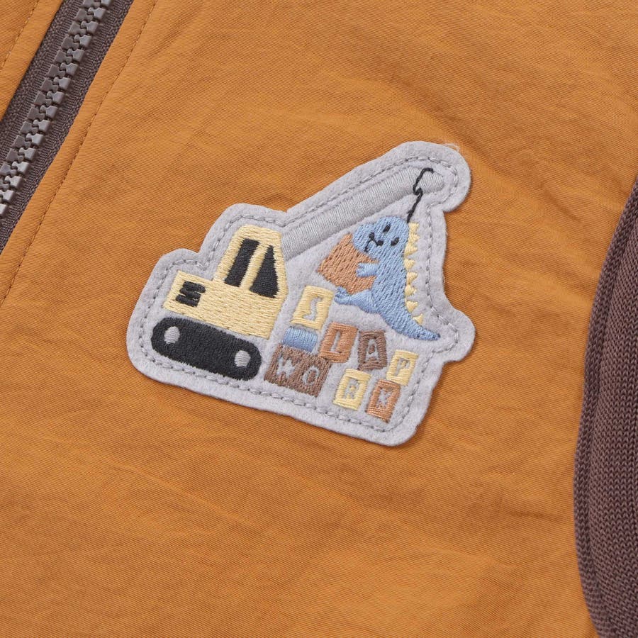 【表:カラフルな「BREAK TIME(休み時間)」の刺しゅう/裏:クレーン車で運ぶ積み木にしがみついている恐竜のワッペン】