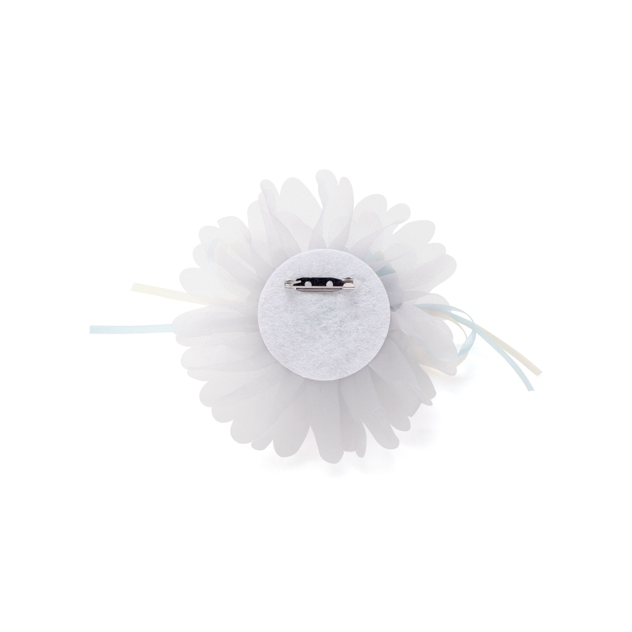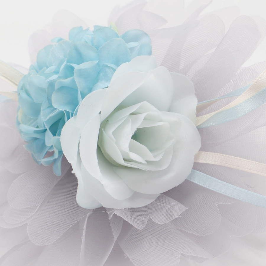 チュールのお花風モチーフの上に2種類のお花をあしらい、華やかさと立体感を演出。