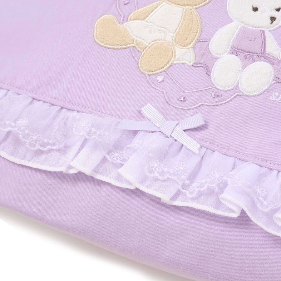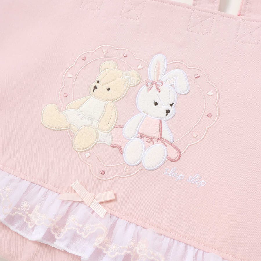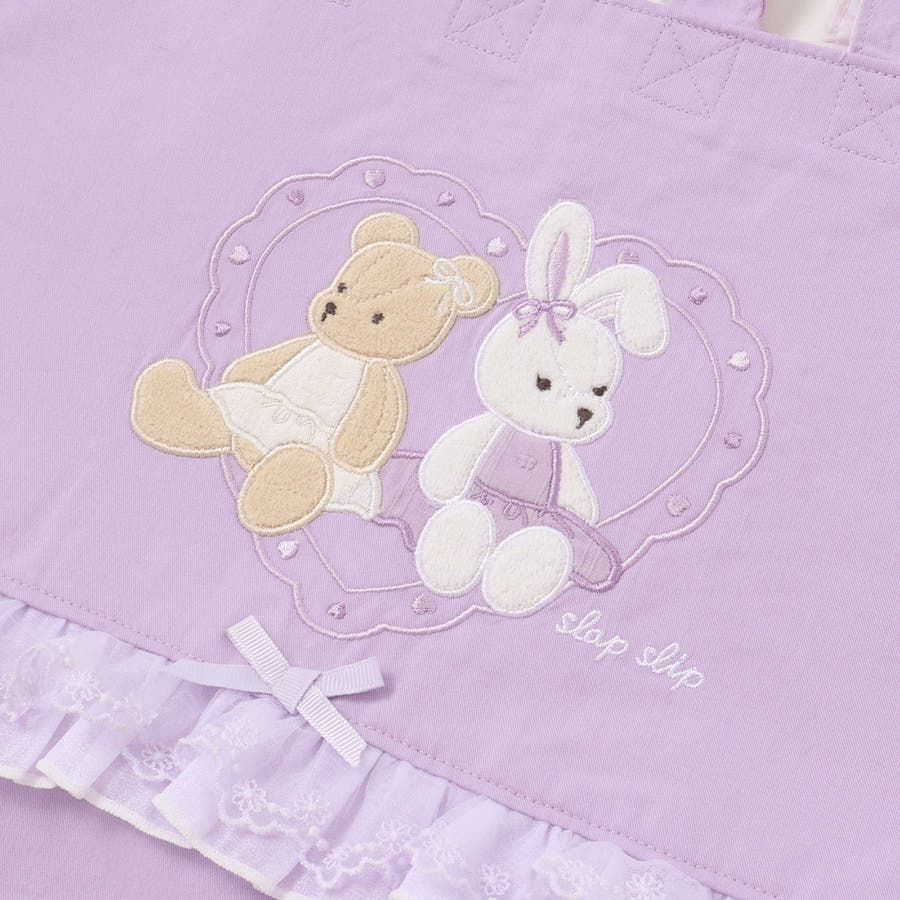 フロントにはパイルやレースを使用したクマとウサギのモチーフをあしらい、ふんわり立体感のある愛らしい表情に仕上げました。