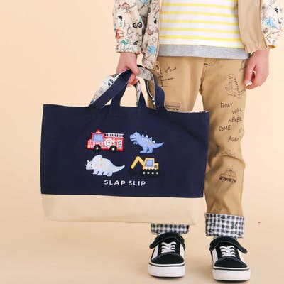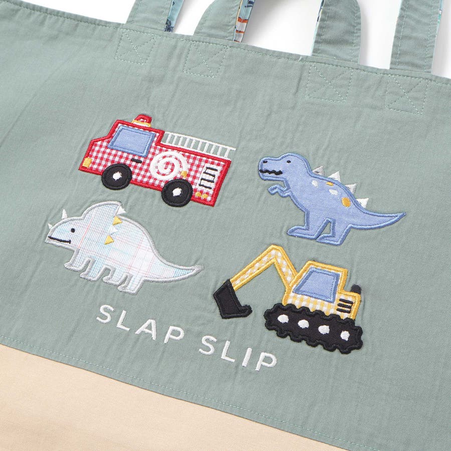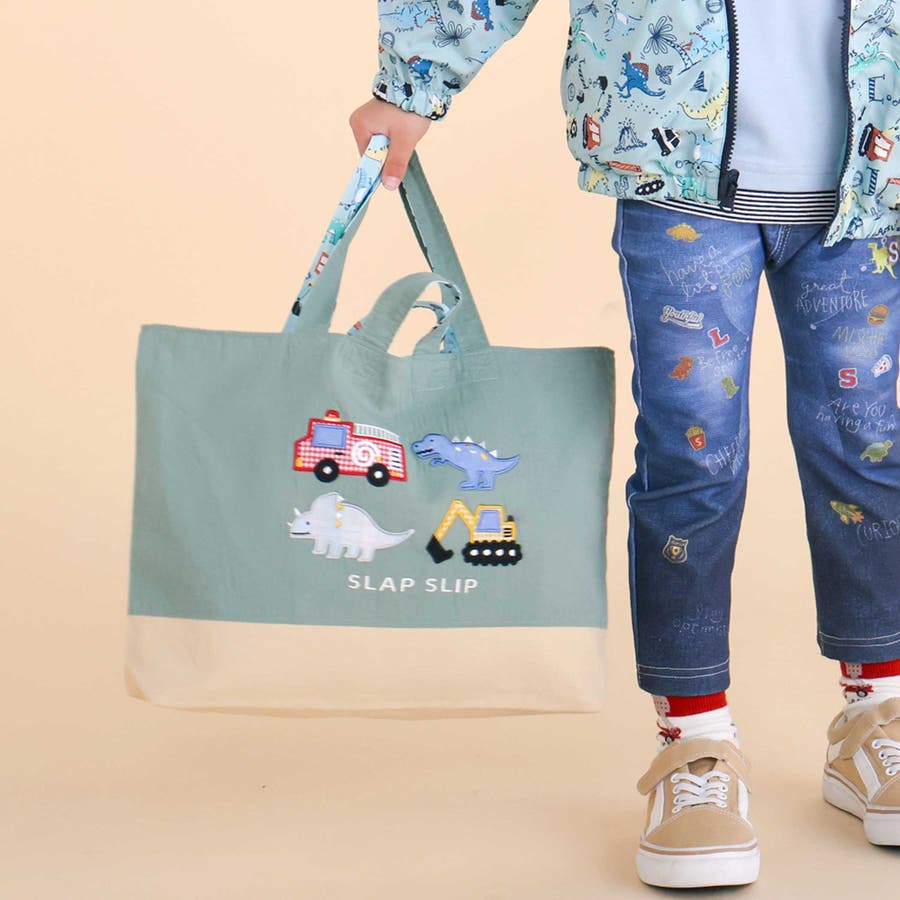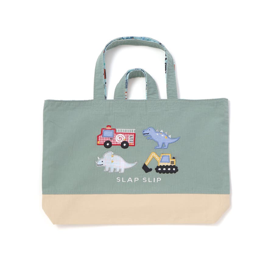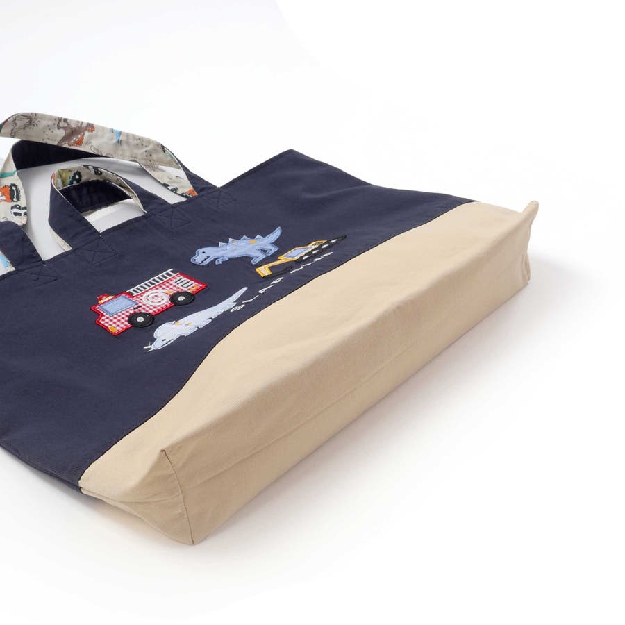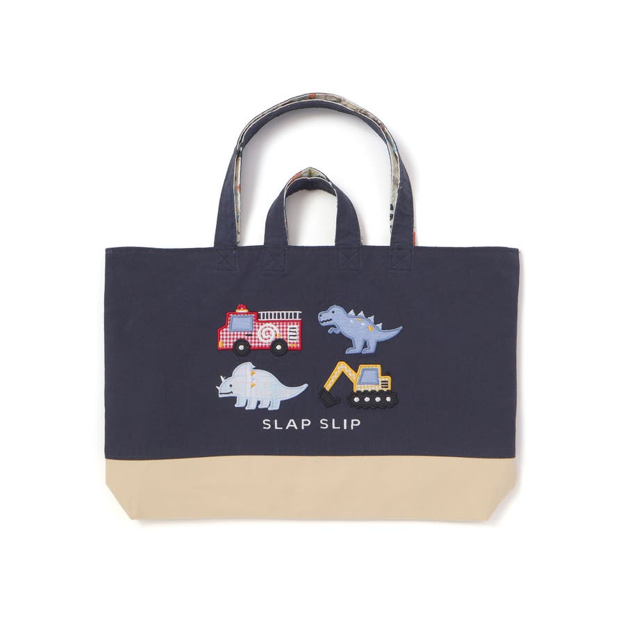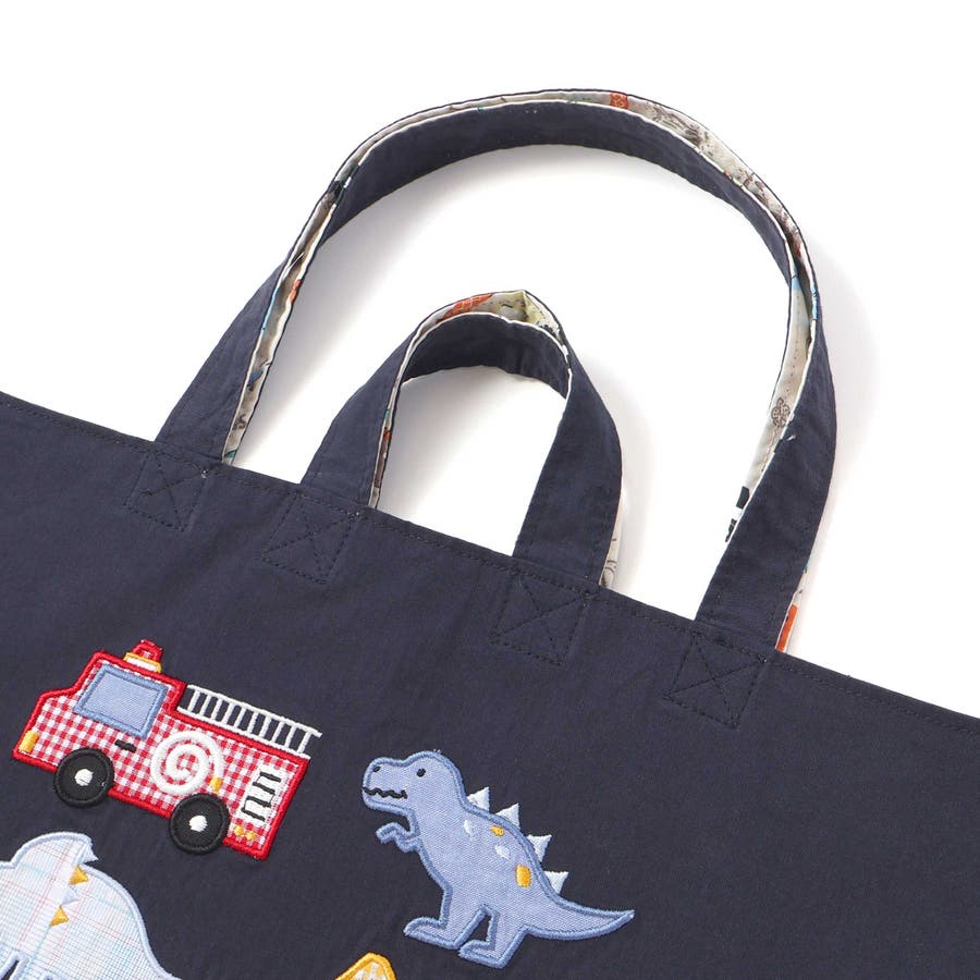 恐竜はたらくくるまパッチ刺しゅうリバーシブルレッスンバッグ