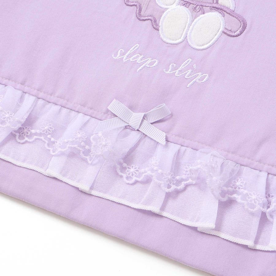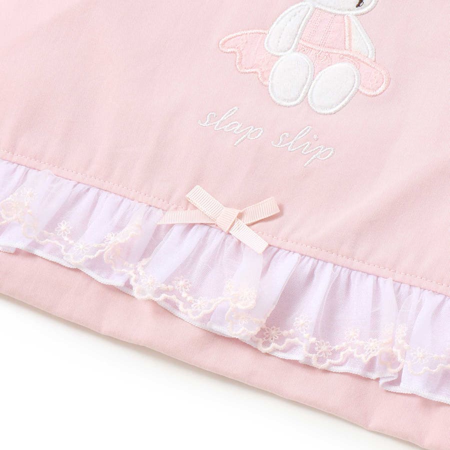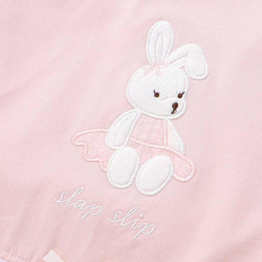 ピンクのドレスでおめかししたウサギさんのパッチ刺しゅうに、キラキラ輝くシフォンフリルと中央のリボンを重ね、ガーリーで華やかな印象に仕上げました。