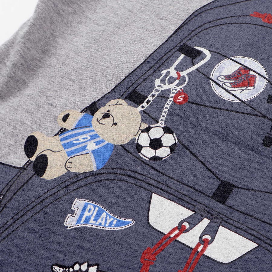 杢グレー×ホワイト:ネイビーのリュックにブルーやベージュのモチーフ。ベージュのクマさんのチャームプリントがポイント。