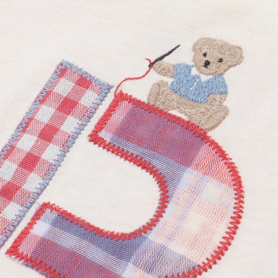 オフホワイト:レッド系のチェックが映えるオフホワイト、パッチ刺しゅうのBの上には針と糸を持ったクマさん。襟付きのお洋服を着ているのが可愛い