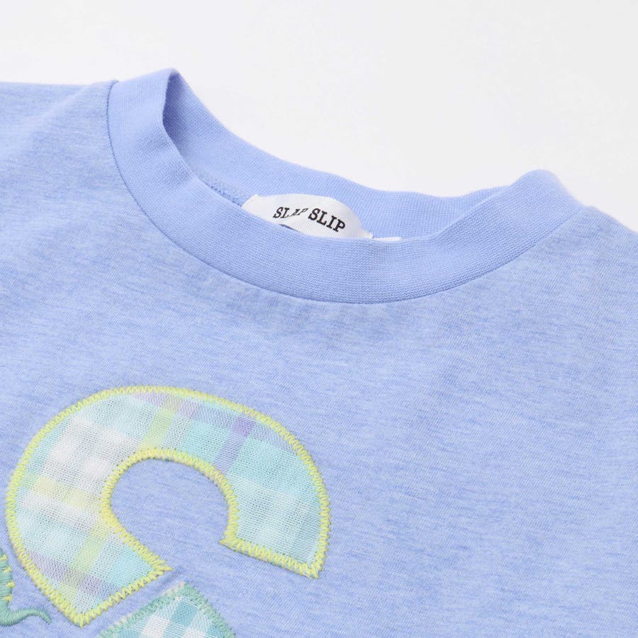 ブルー:ブルー系のチェックがさわやかなブルー、パッチ刺しゅうのSには針と糸を持った恐竜さん。大きなお口をあけているのがポイント