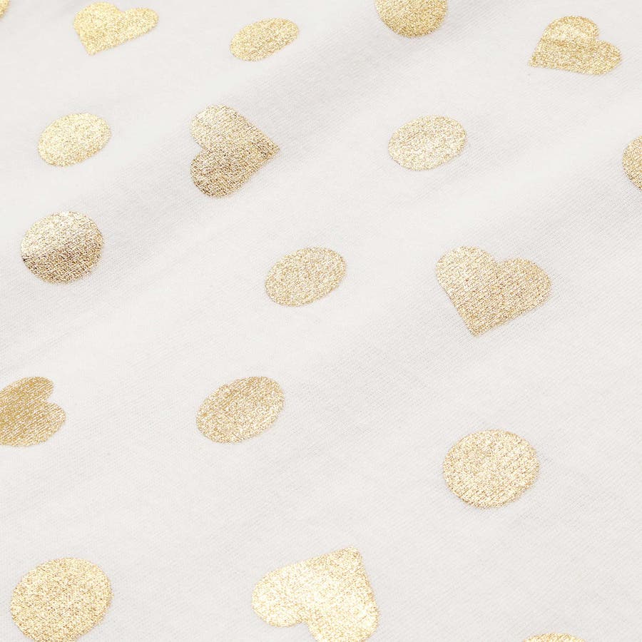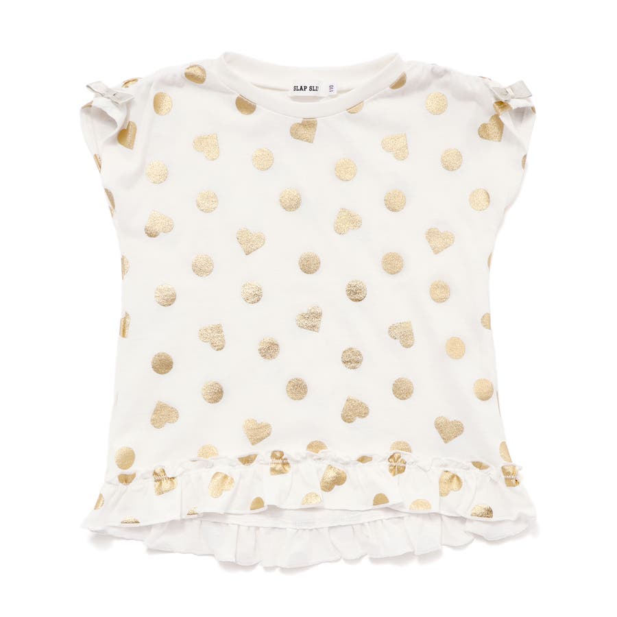 ゴールドやシルバーの箔プリントがパッと目を引く女の子用半袖Tシャツ。