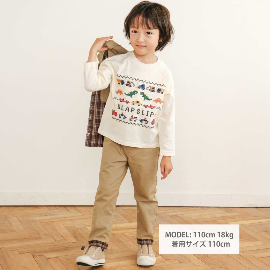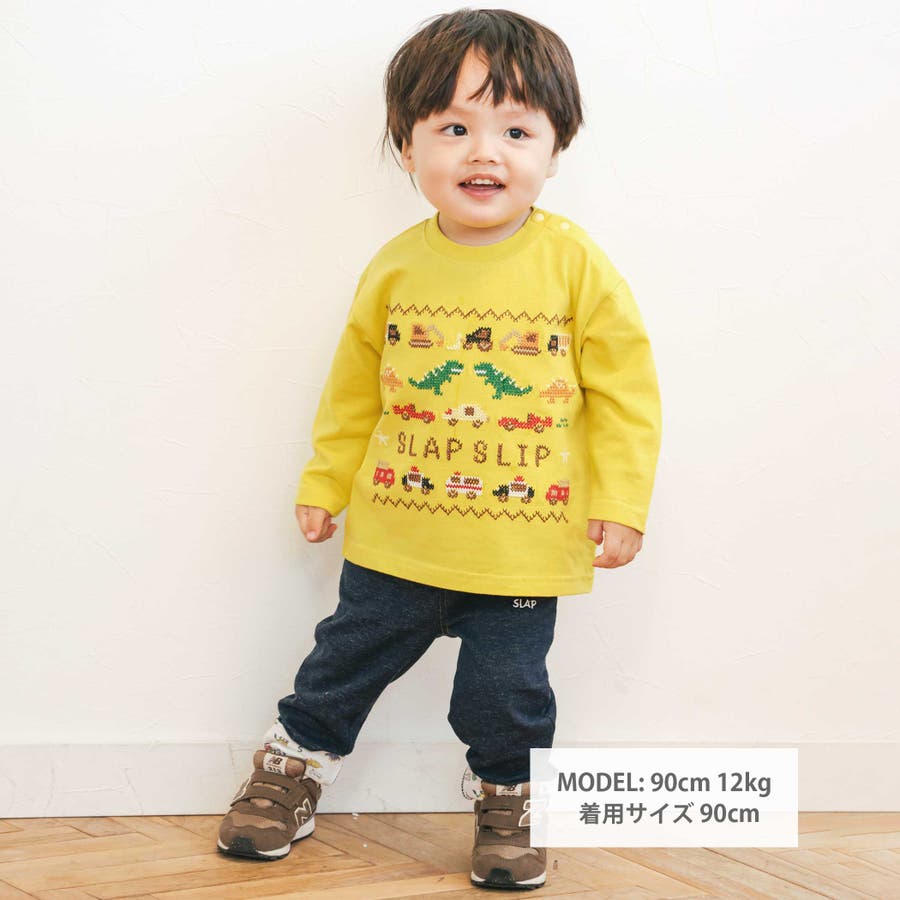 フロントにステッチ刺しゅうであしらったはたらくくるまや恐竜のモチーフがパッと目を引くアイテムになっています。