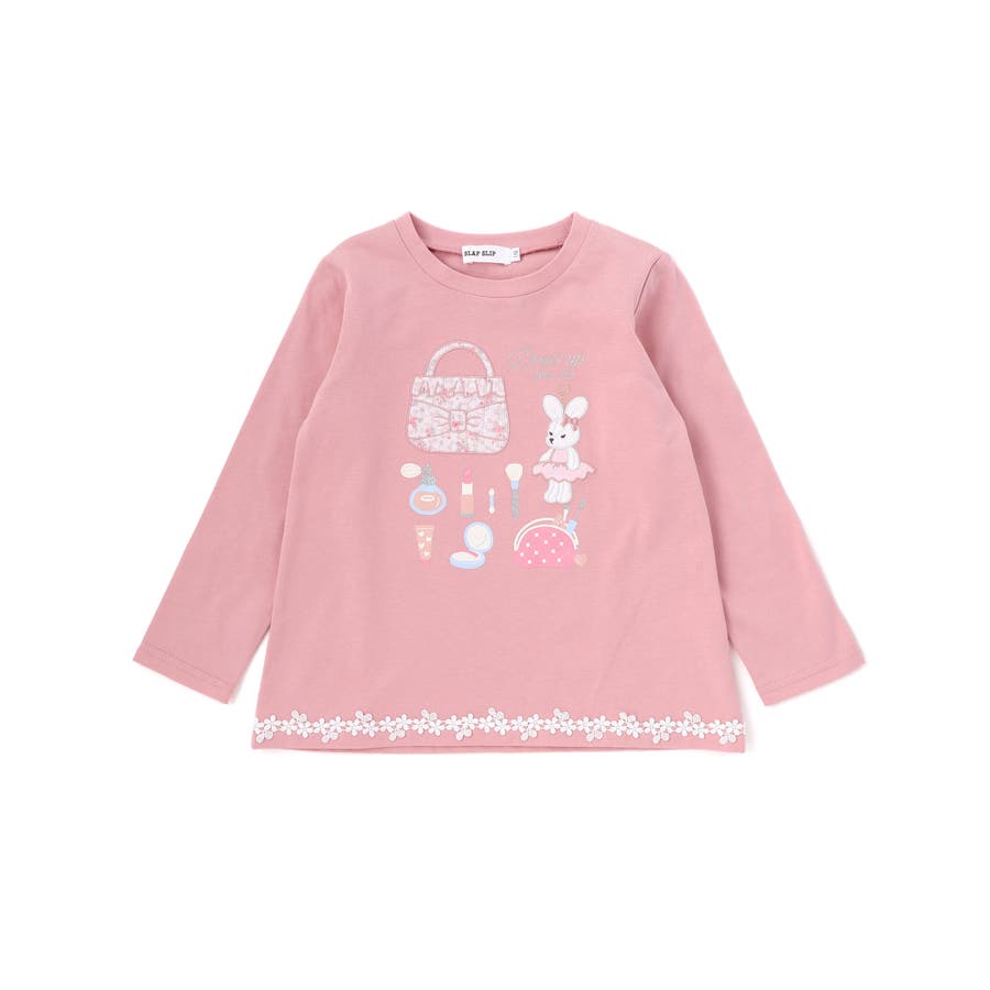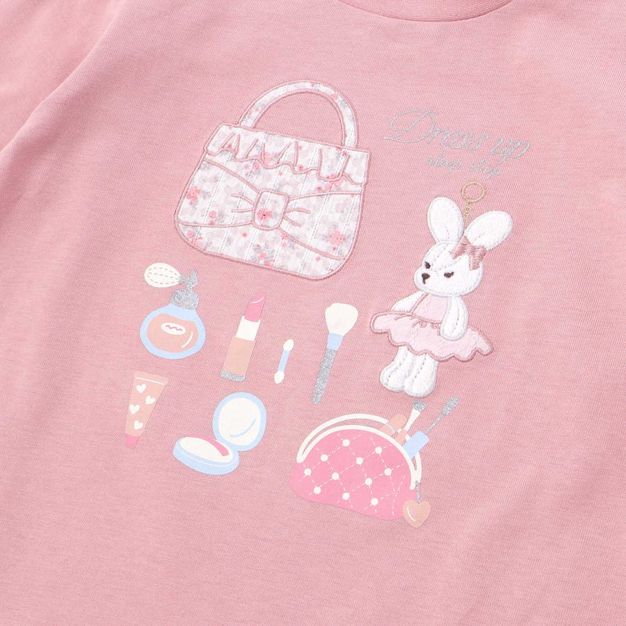 ピンクは、ワンピースを着たウサギとリボン付きハンドバッグをパッチ風にあしらい、さまざまなコスメアイテムのプリントでおしゃれ気分を高めます。