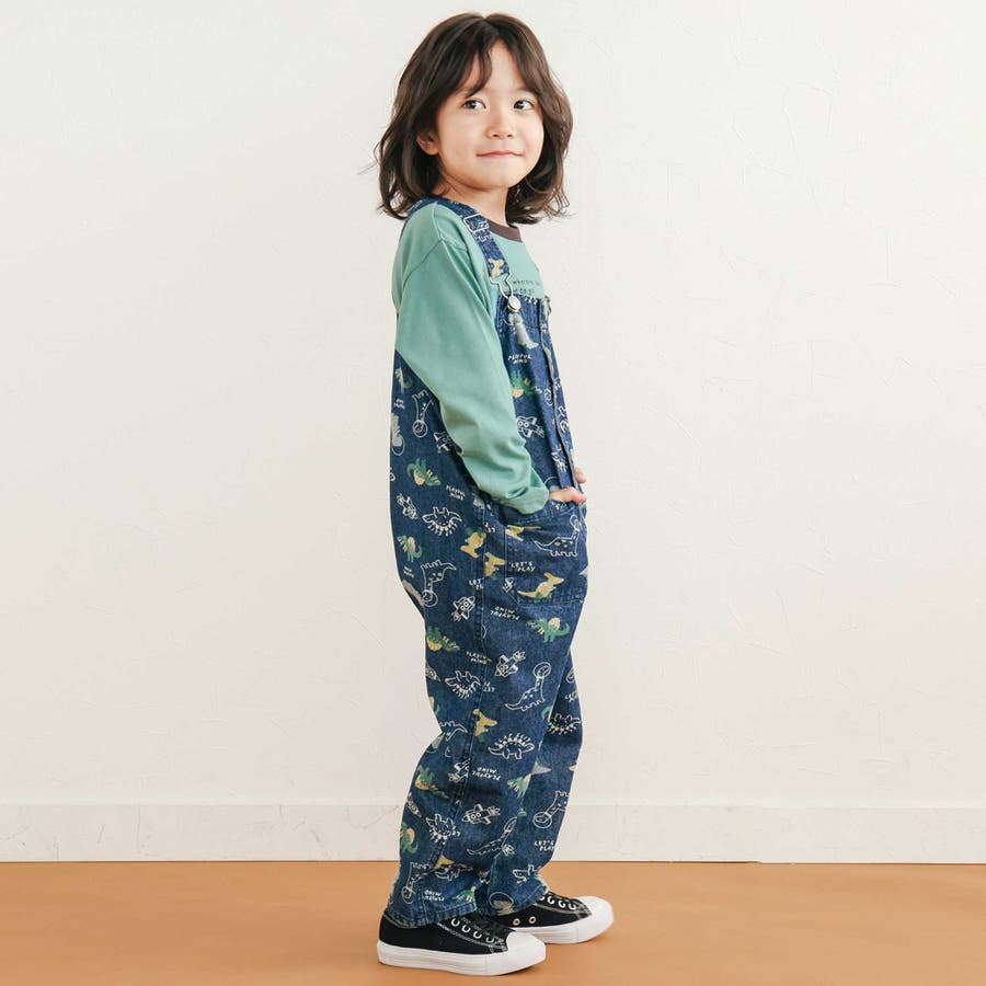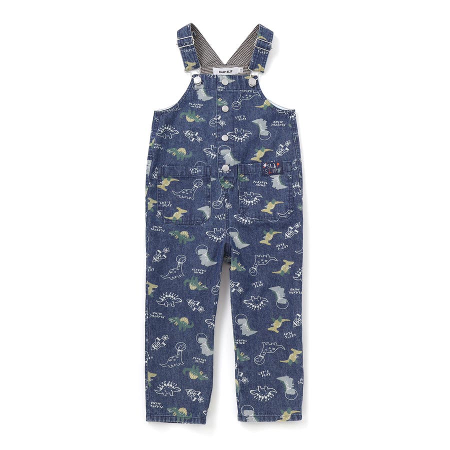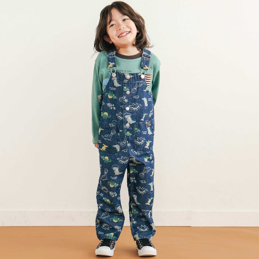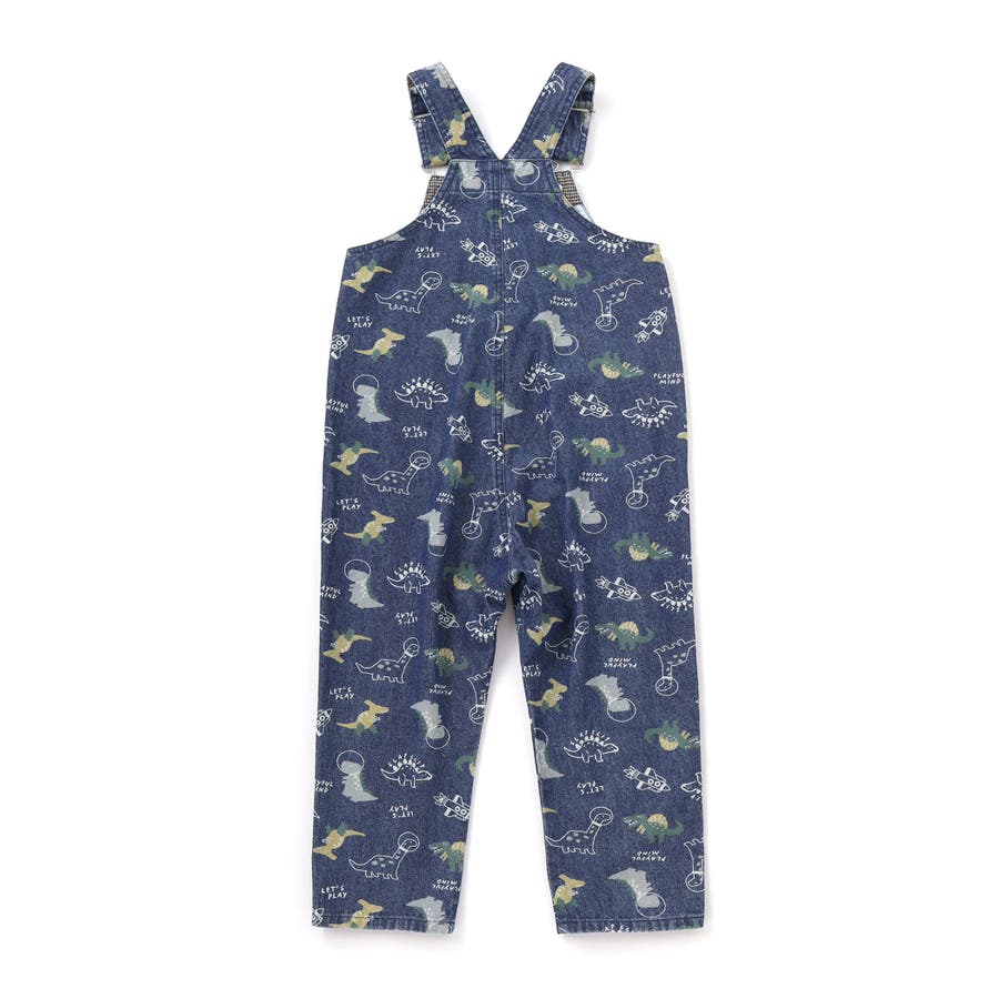 【お揃い】デニムツイル恐竜ロケット総柄サロペット(80~120cm)