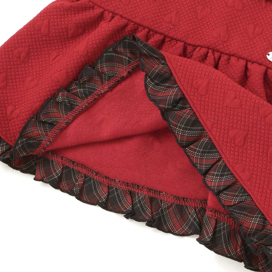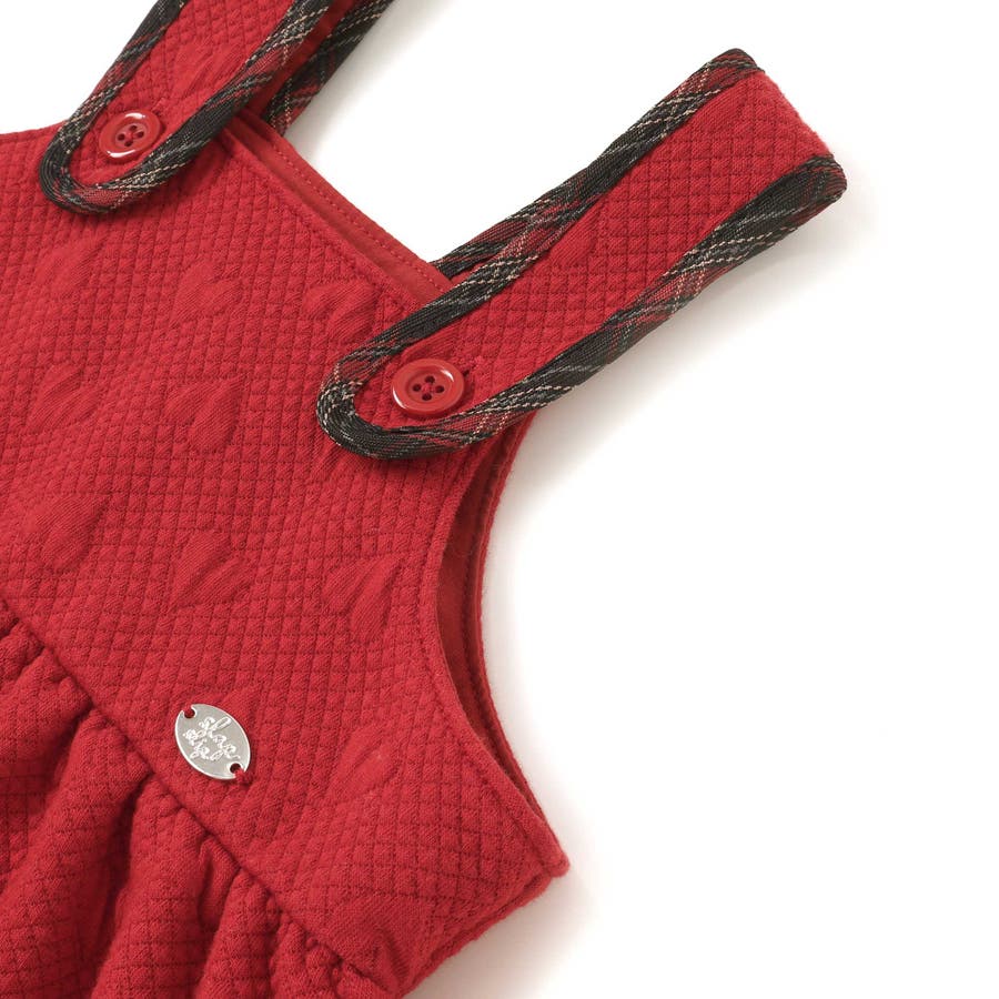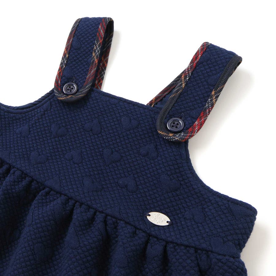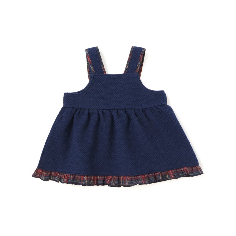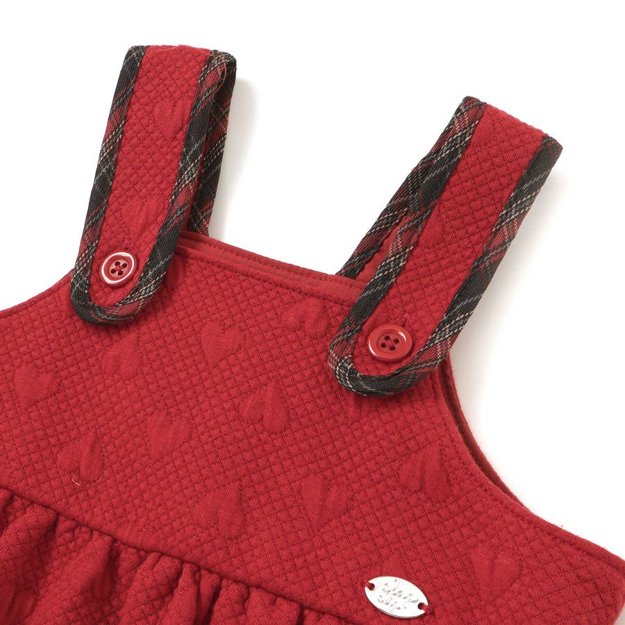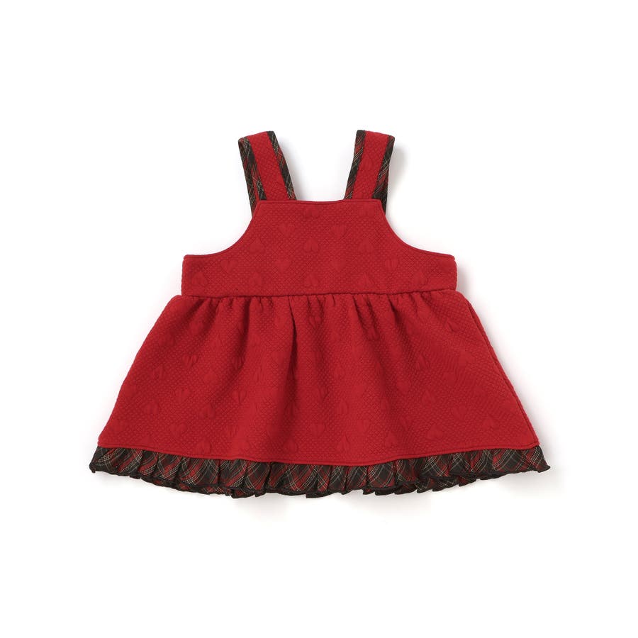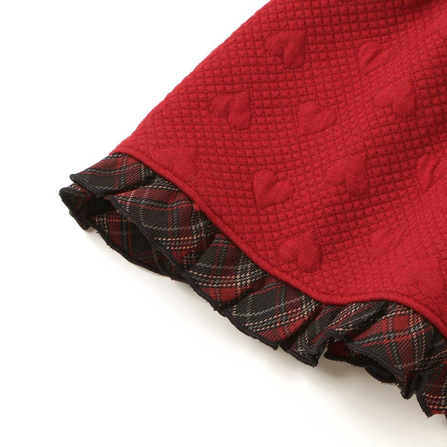 ジャンパースカートはハート柄のキルト素材を使用し、裾フリルと肩紐のチェックパイピングが可愛らしいアクセントに。