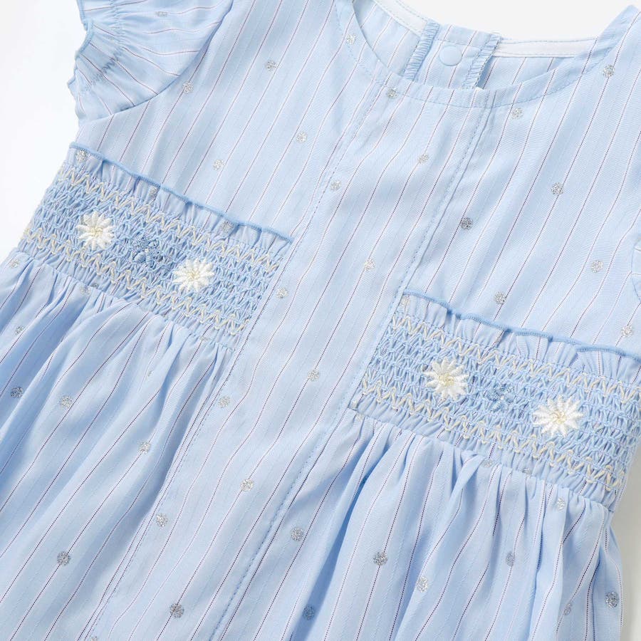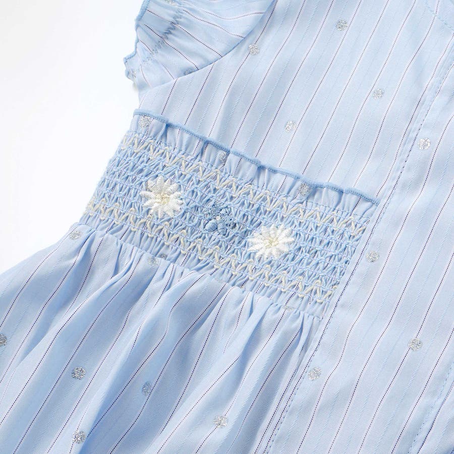 ワンピースのフロントには、丁寧に施されたスモッキング刺しゅうをオン。