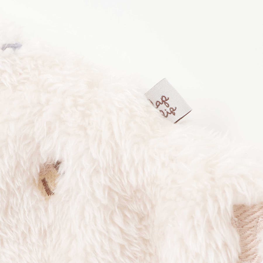 オフホワイト:襟付きのお洋服を着たイヌさん、アルファベット、木馬、おもちゃの刺しゅうがかわいい。ストライプのパイピングがアクセントに
