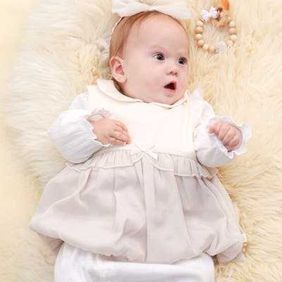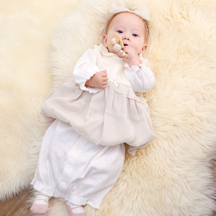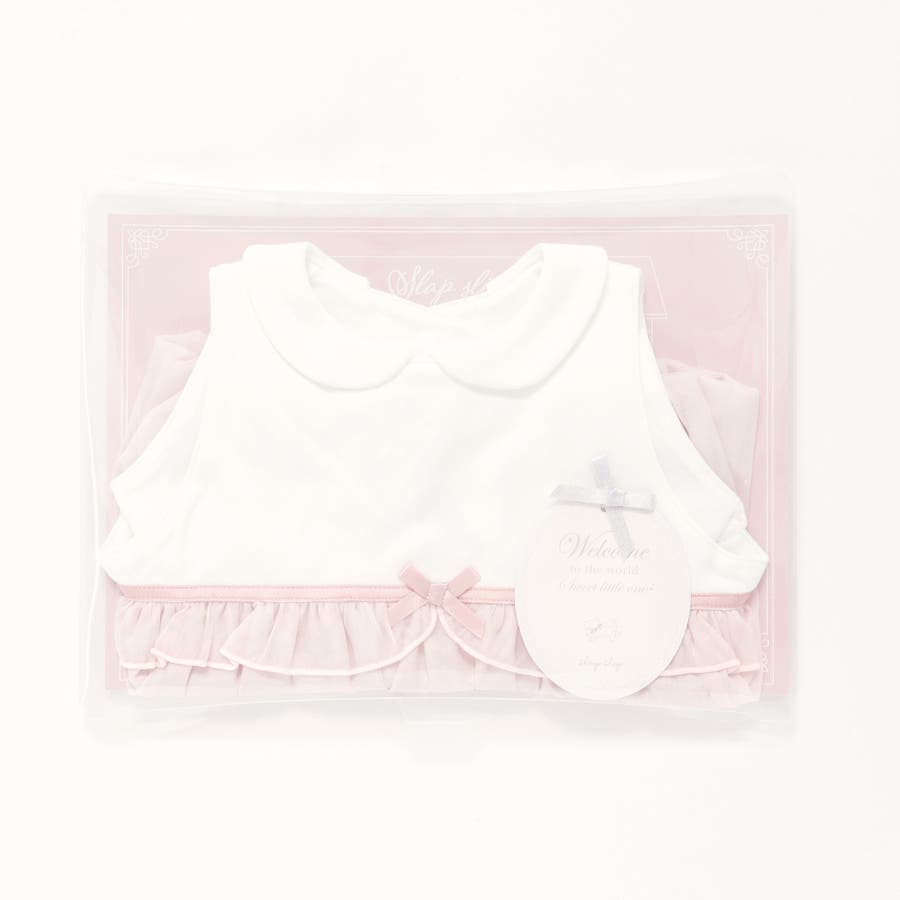 優しい色味で統一したフェミニンなオフホワイト、女の子らしいピンクのフリルやスカートが可愛いピンクの2色展開です。