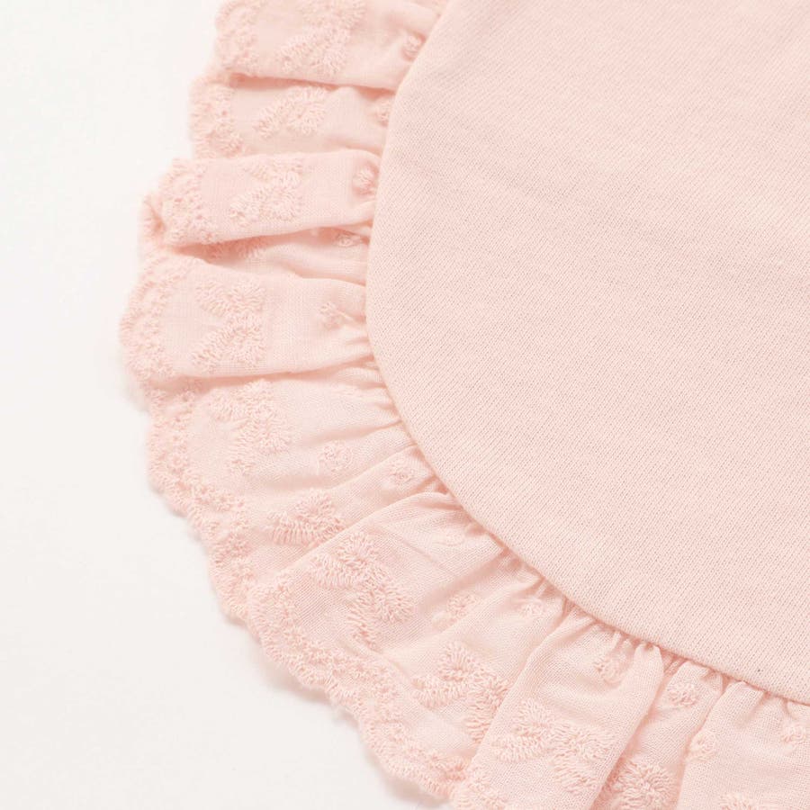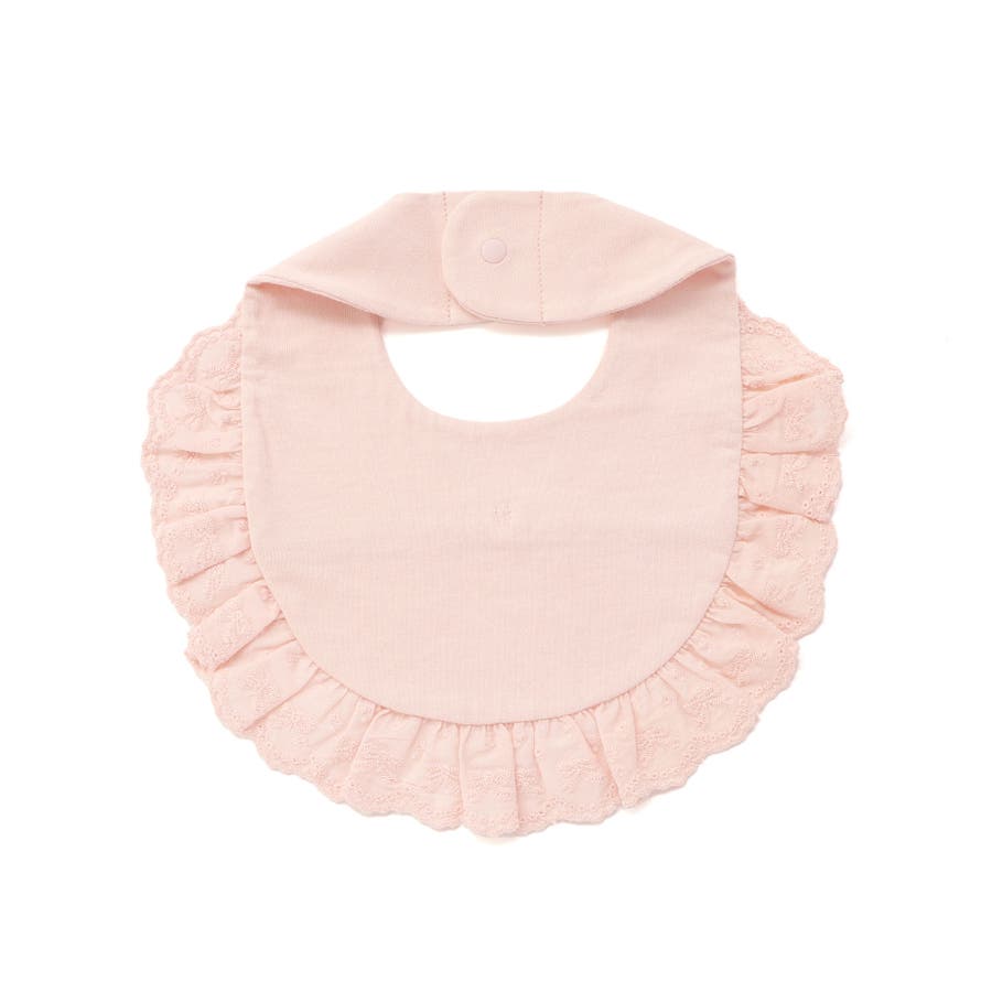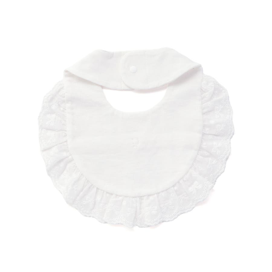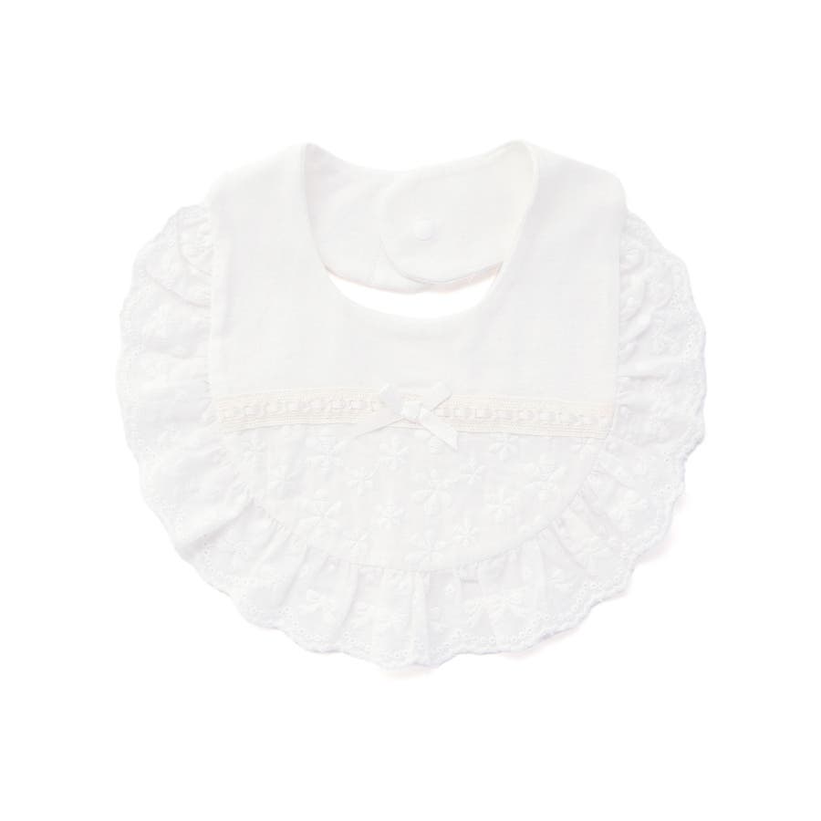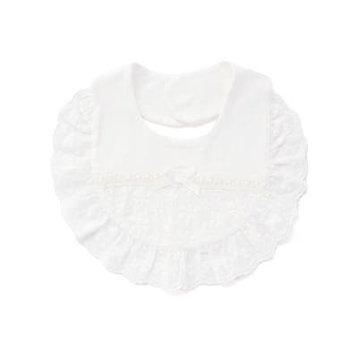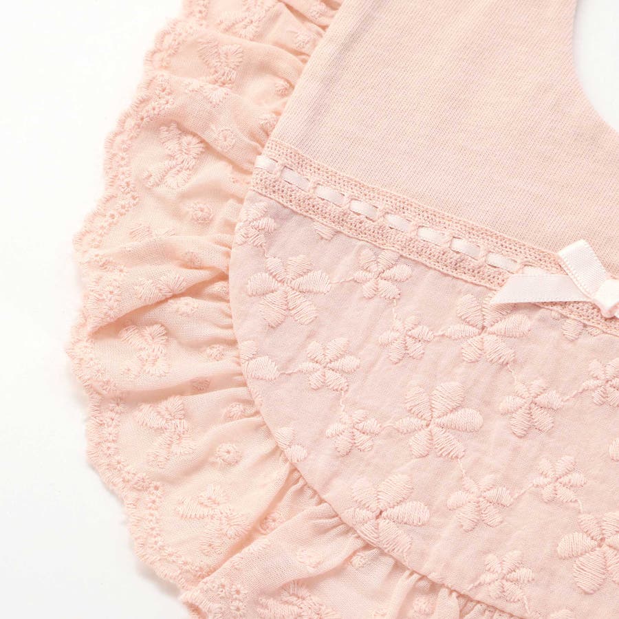切り替え下のレースにはお花、縁のレースにはリボン…女の子がキュンとときめくモチーフがたくさん入ったスタイ。