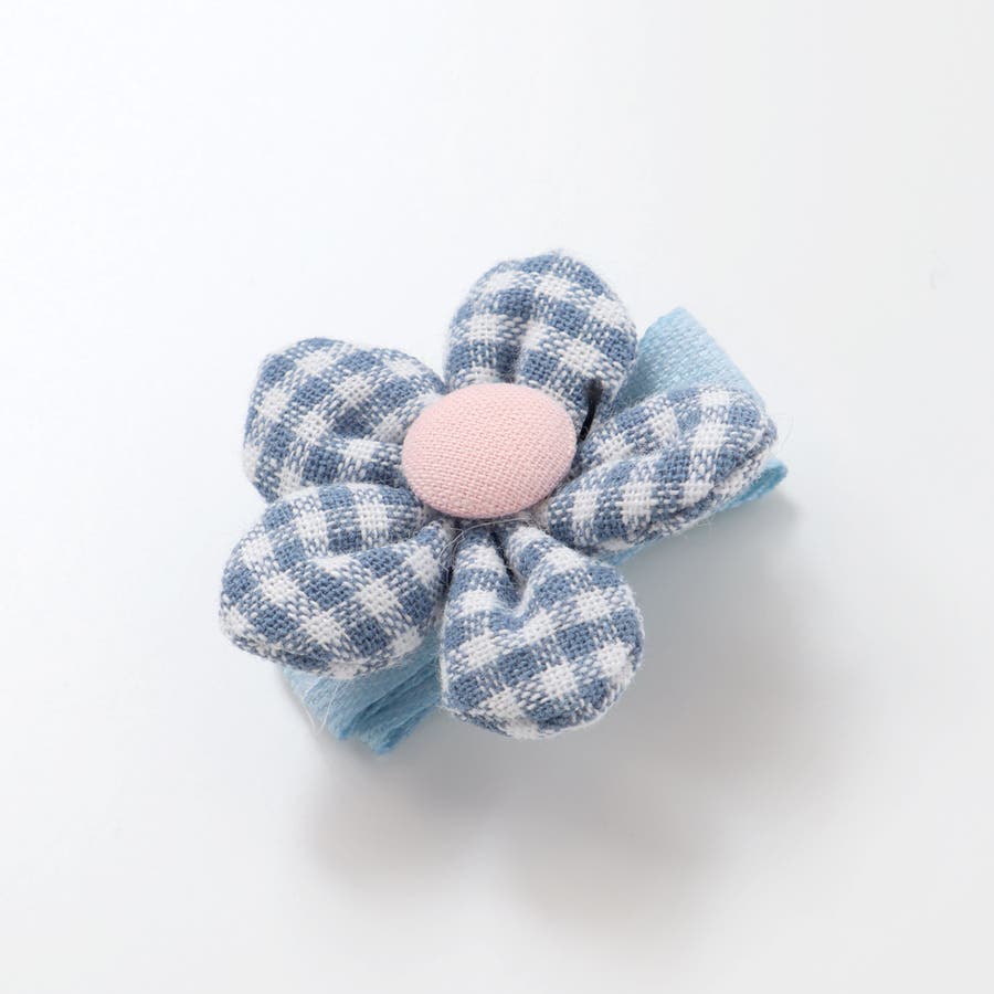 ブルー系:ネイビーの大きなお花ヘアピンを中心に、レースフリルが可愛いリボン、まんまるボタンがアクセントのデザインをセットにした、大人っぽさも可愛さも楽しめる組み合わせ。