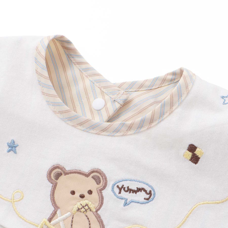 ホワイト:イエローのズボンをはいてクッキーをもぐもぐするクマさんや、お星さま、クッキーを分け合うクマさんの刺しゅうがかわいい。
