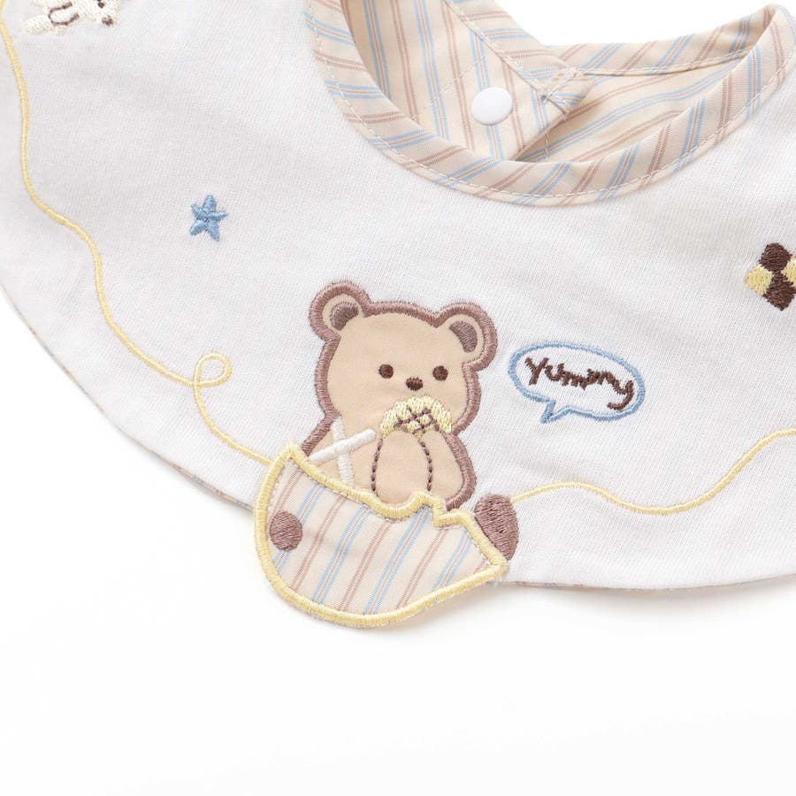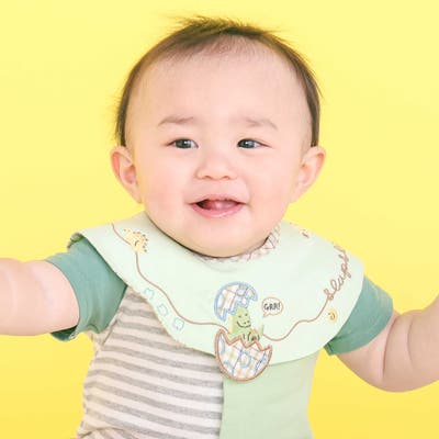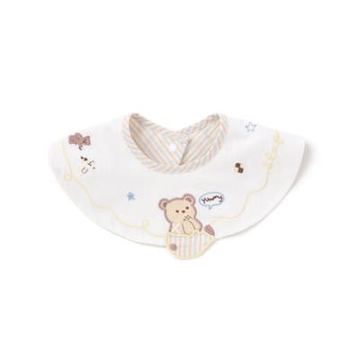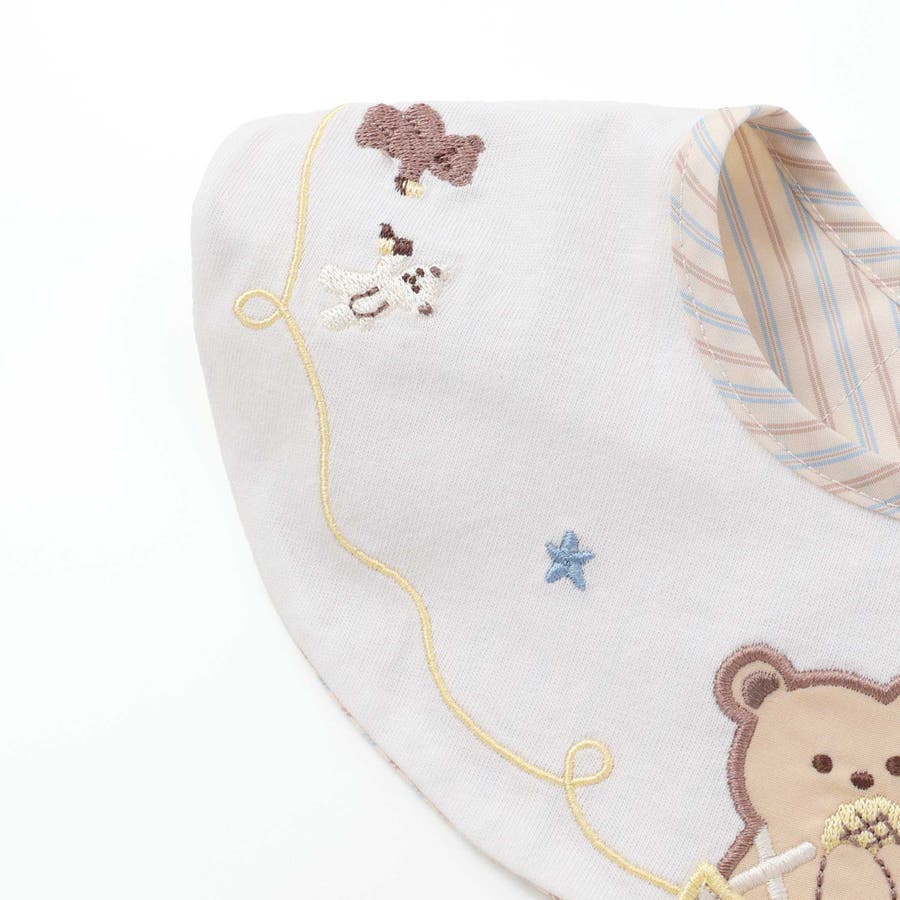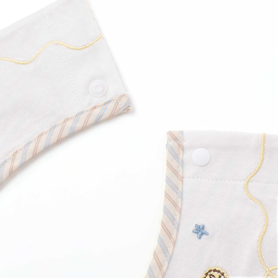 まあるいフォルムに、遊び心あふれる刺しゅうをのせた男の子用スタイ。