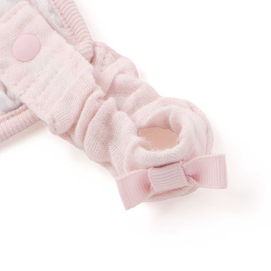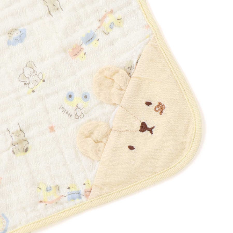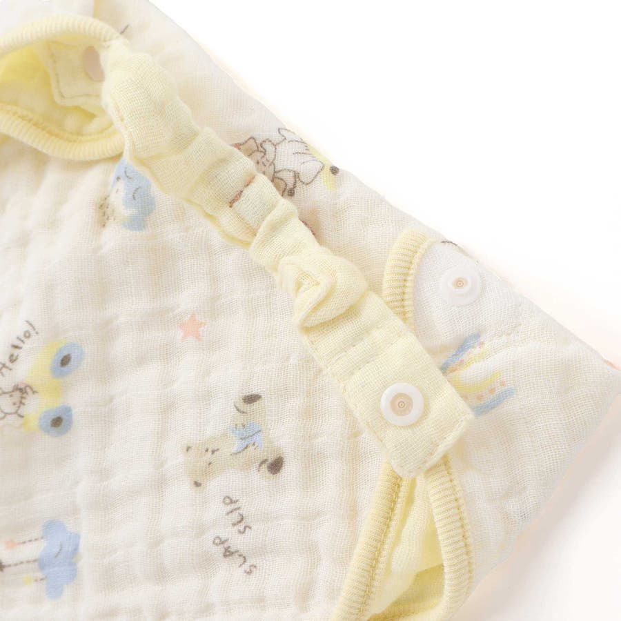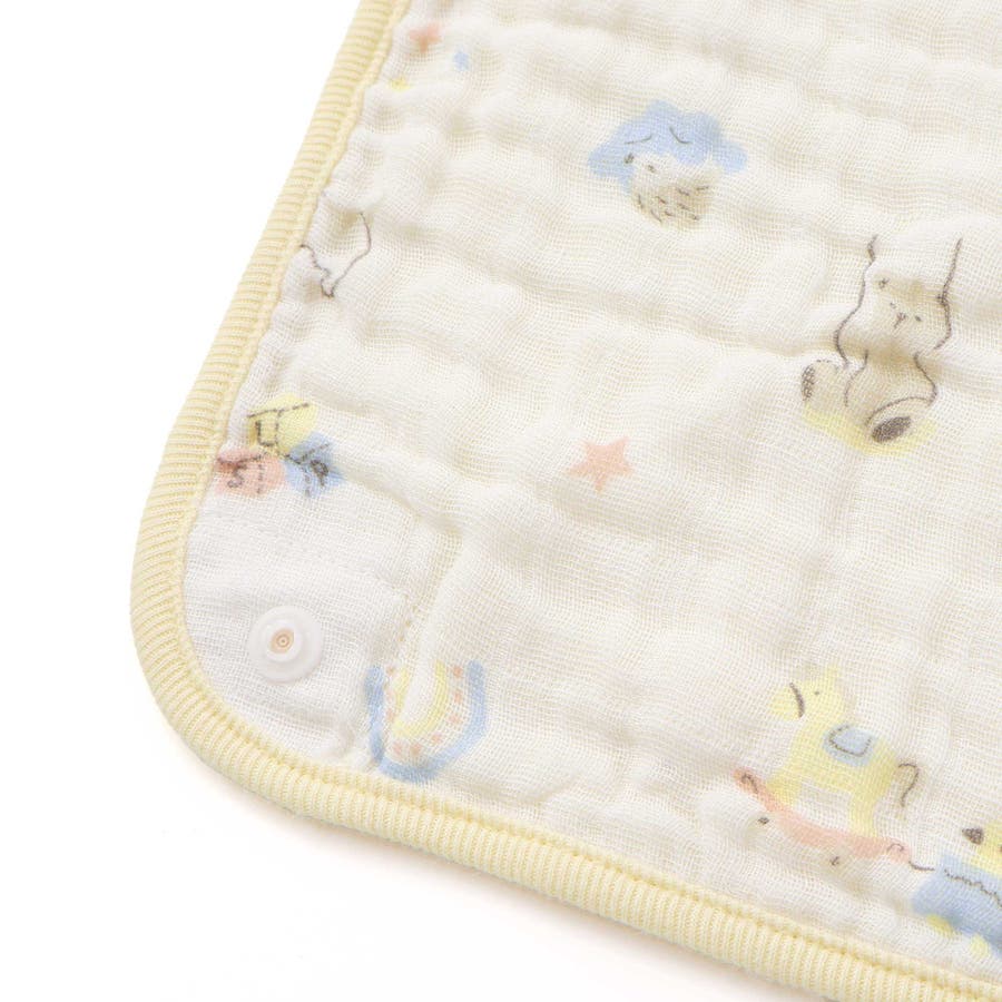 素材にはダブルガーゼを一枚仕立てにした生地を使用し、軽やかで通気性がよく、デリケートな赤ちゃんの肌にもやさしい使い心地です。