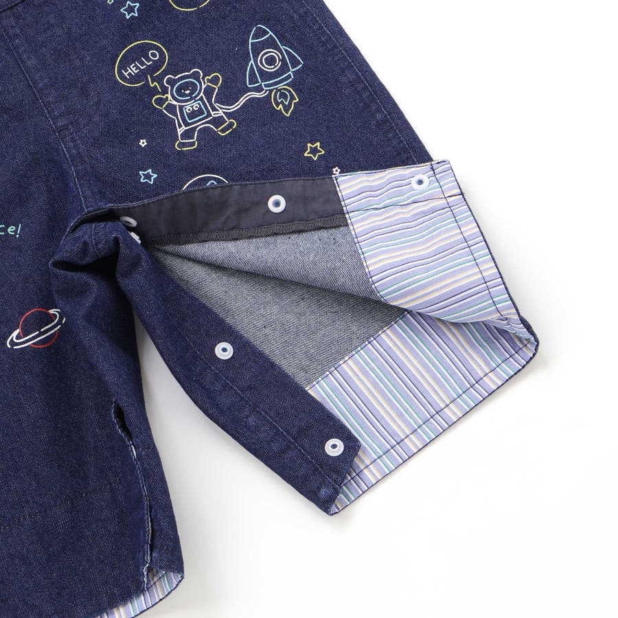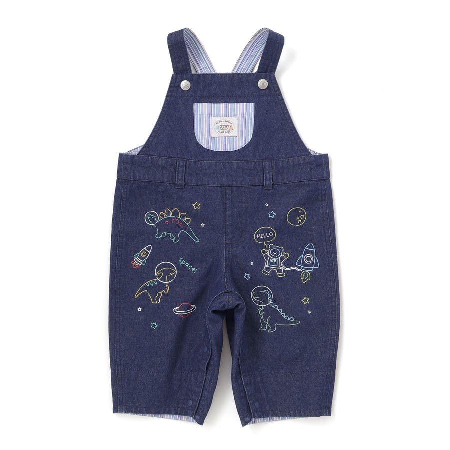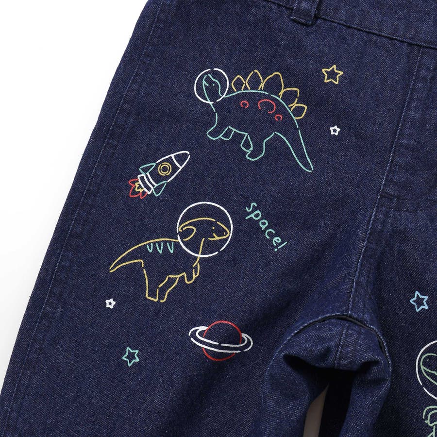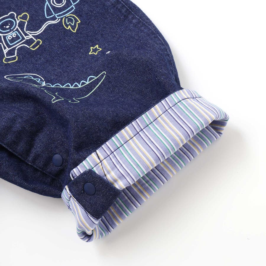 ネイビー:デニム生地には恐竜と宇宙のモチーフのプリントをオン!男の子の夢がギュギュっと詰め込みました。