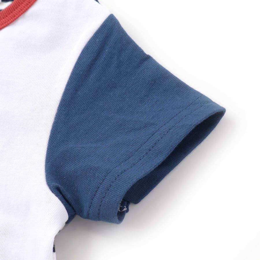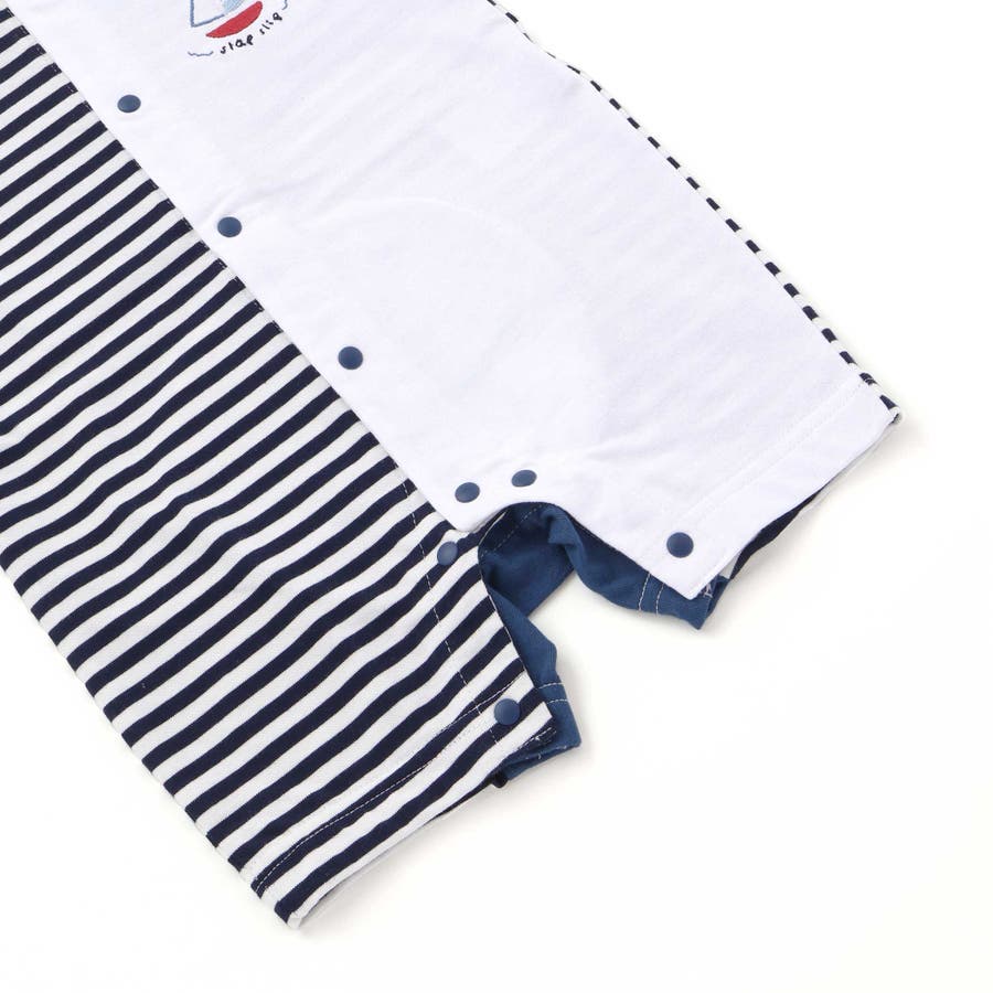 ボーダーと無地のコントラストが楽しい、ポップな雰囲気の男の子用半袖ロンパース。